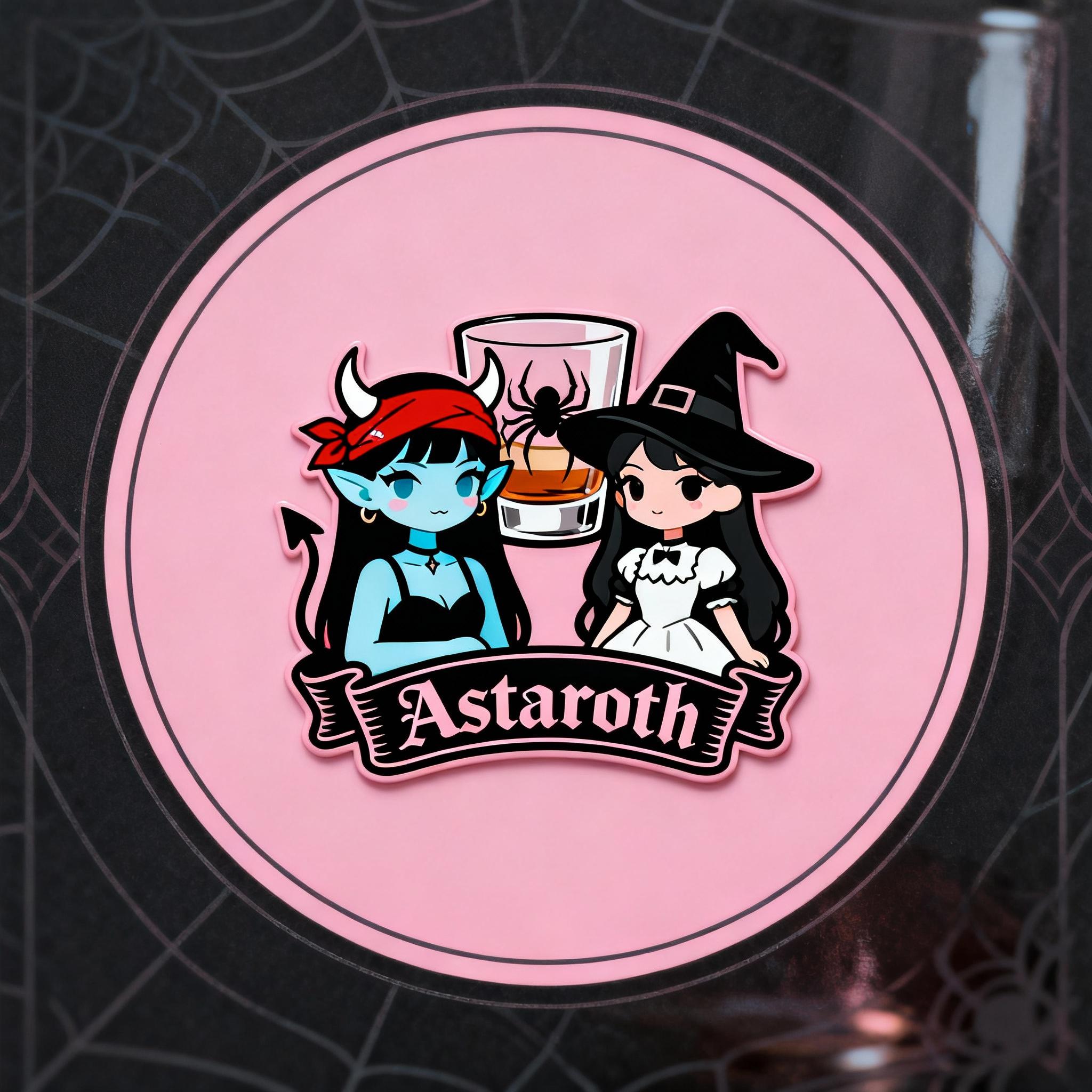 3枚目:青白い肌の女悪魔と白い肌の魔女とウィスキーをモチーフにしたエンブレム デフォルメされていて可愛い "Astaroth"の刻印