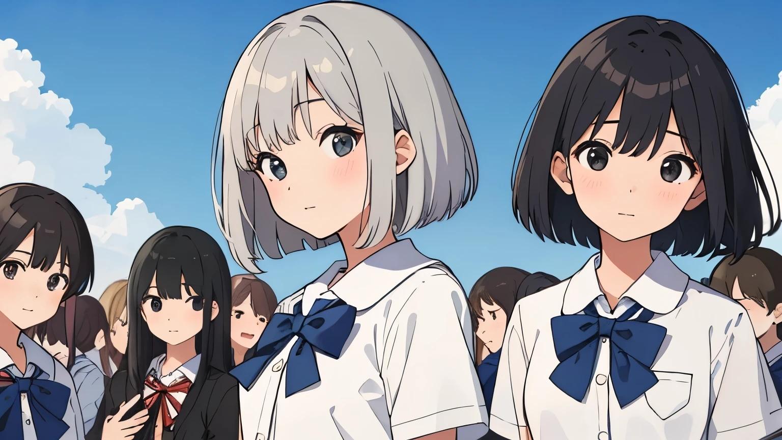 銀髪ボブちゃんと黒髪ボブちゃんの学生服姿
