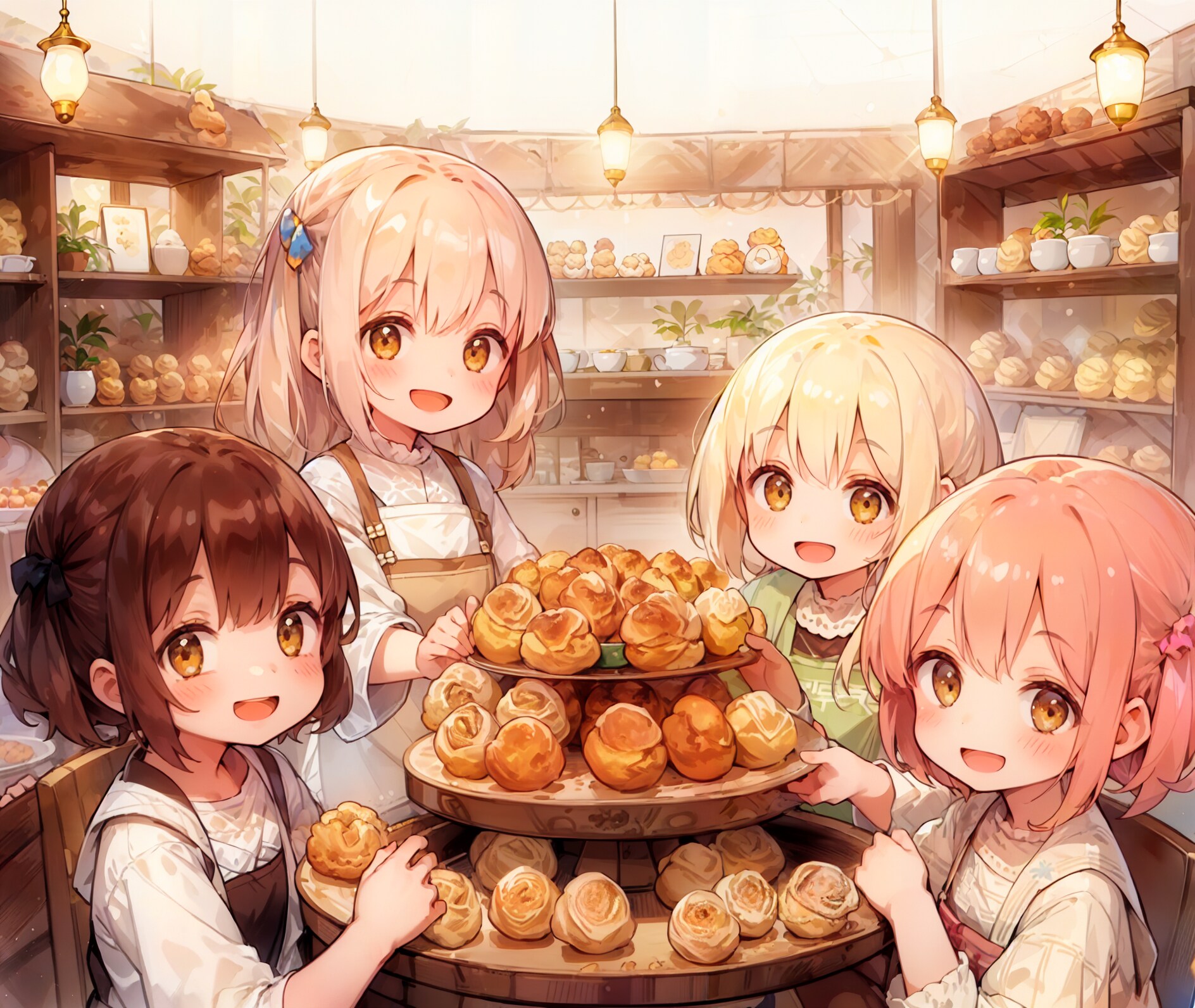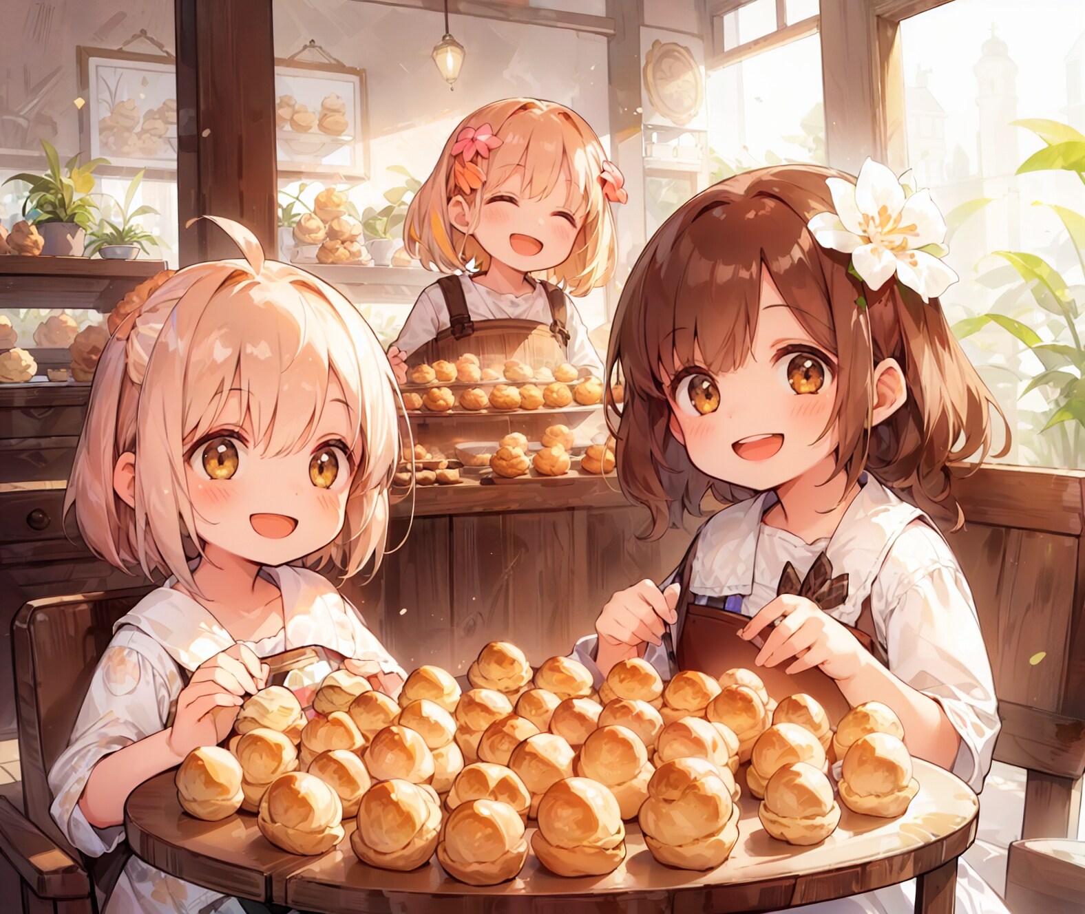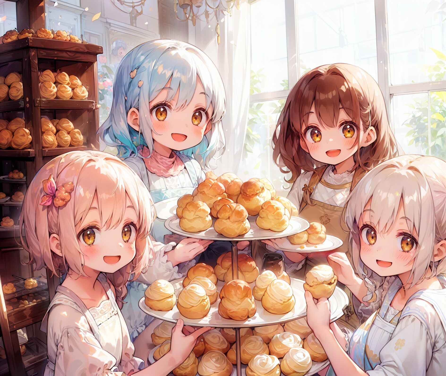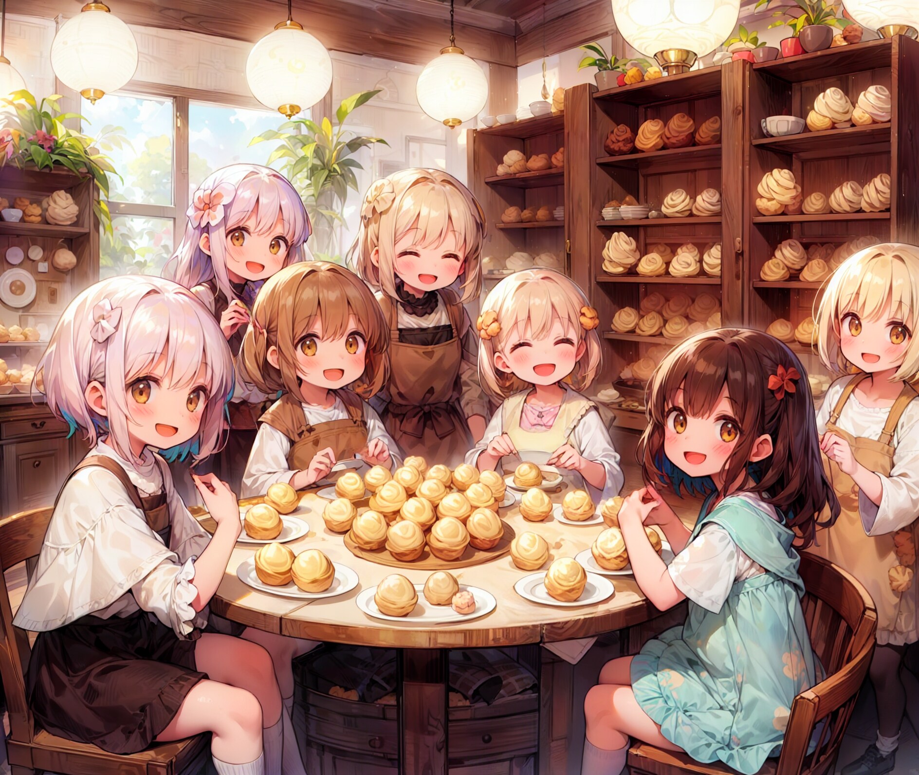 たくさんのシュークリームをたべる女の子たちを作ってみました。