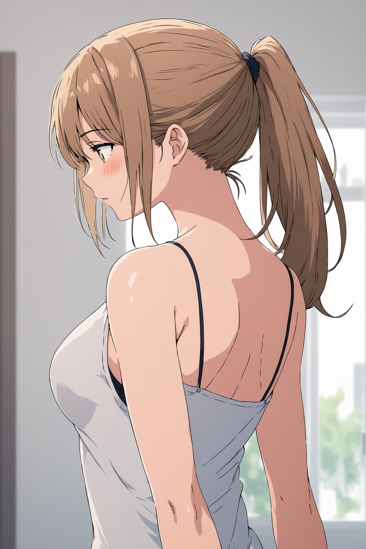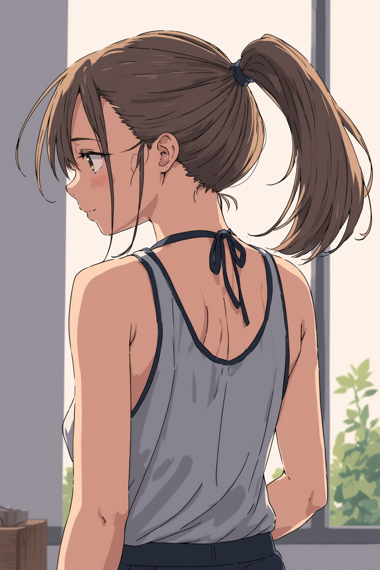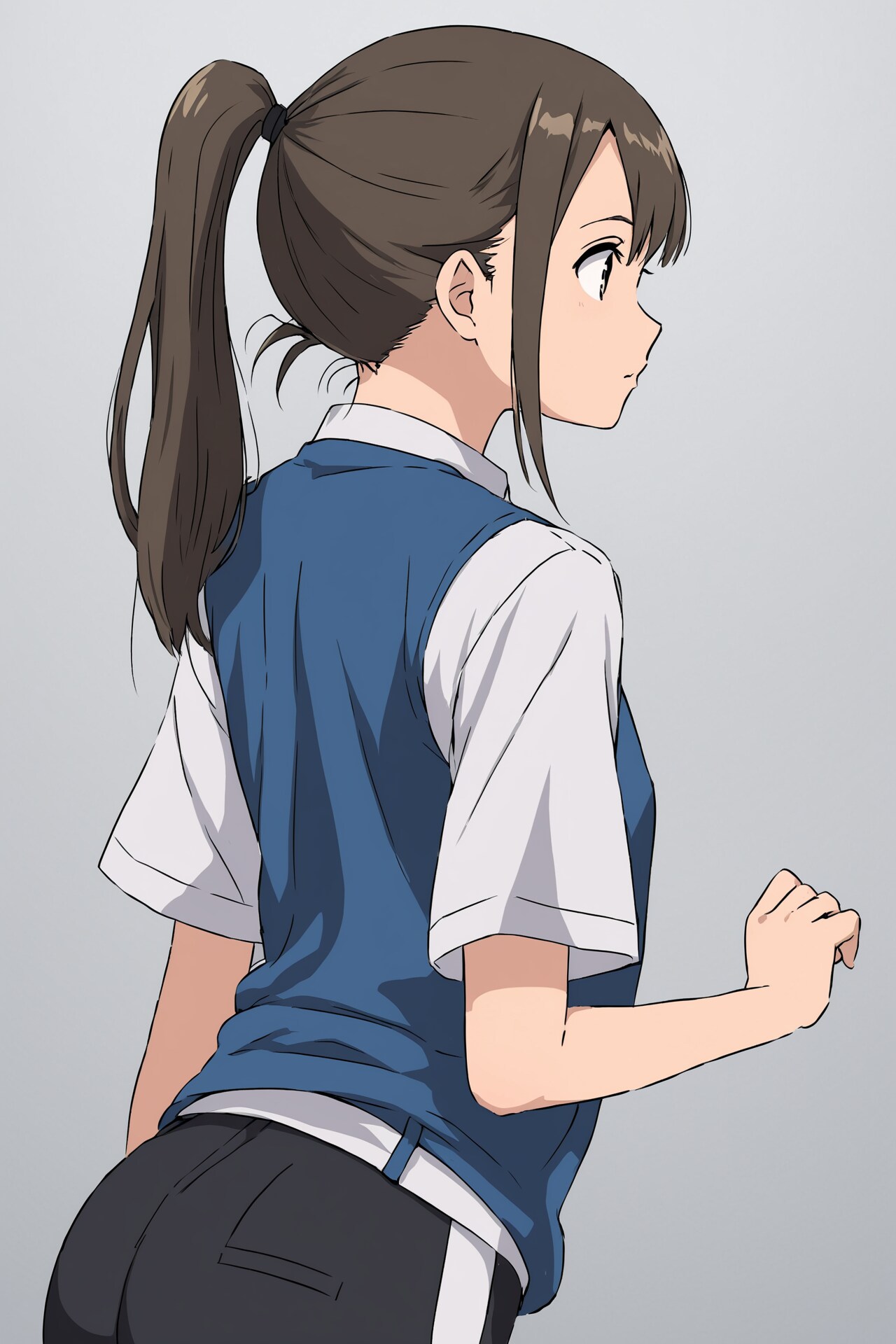 真正面からだとポニテが判りづらいので、敢えて横向きにしているのだと思われます。