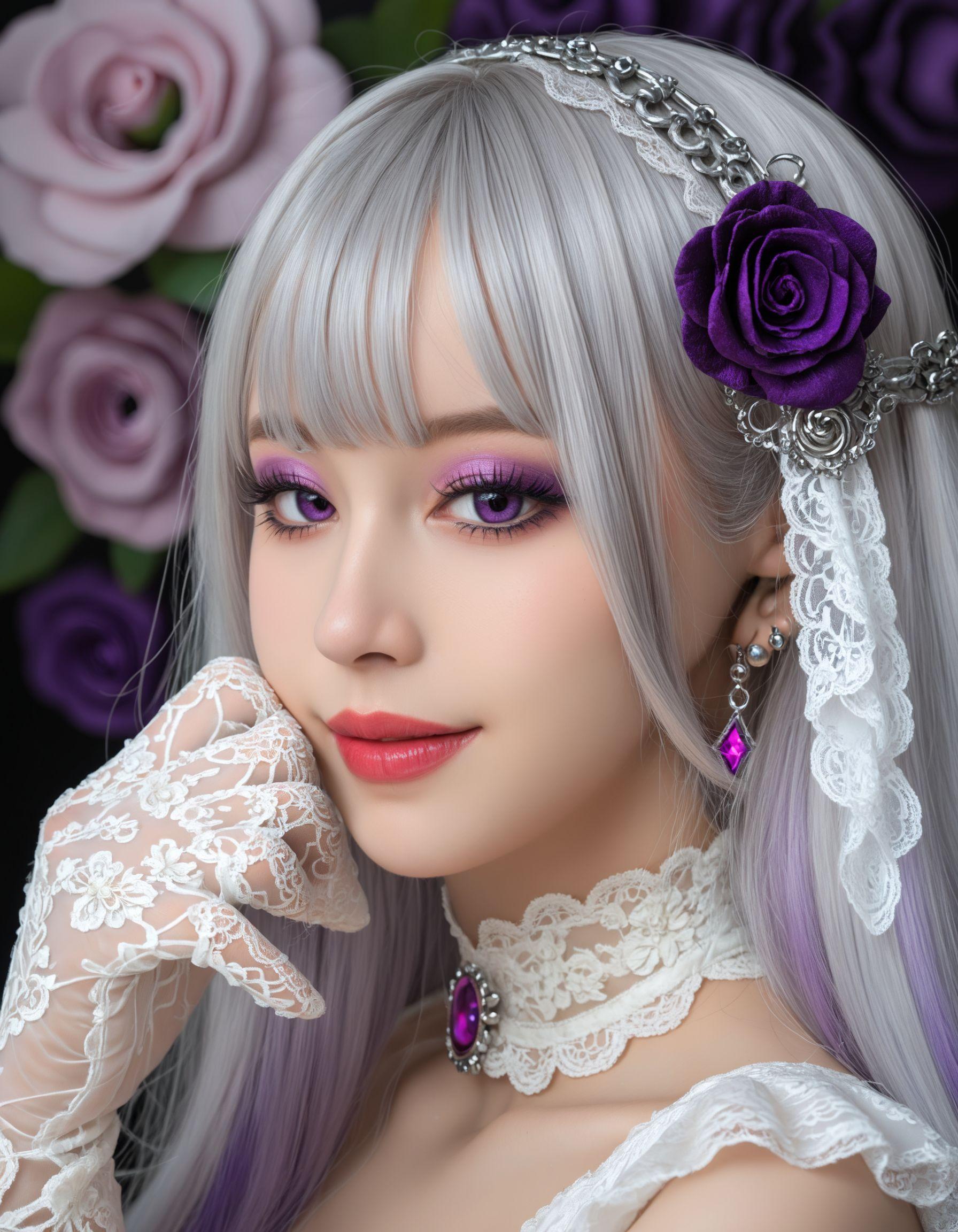 紫の薔薇とレースが紡ぐ妖艶な微笑み