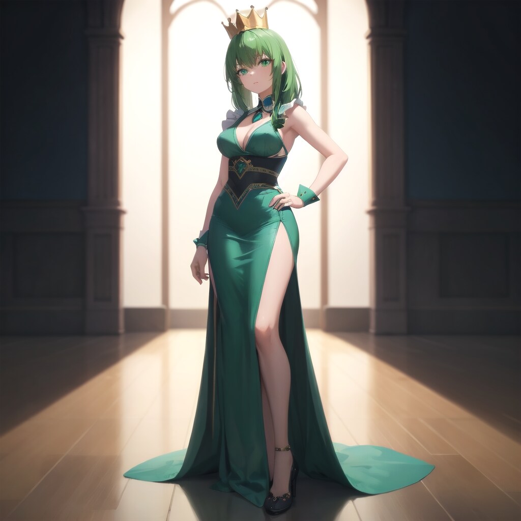 用意されたのは、彼女の細い体型とクールな雰囲気を引き立てる、深い緑を基調としたモード寄りのプリンセスドレス。
