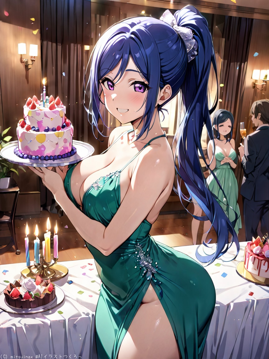部屋とケーキで誕生日祝いの光景をプロンプトしたけど普通にだと夏服&色気路線なのばかりできて長袖のもあとはパーティードレスで誕生会🎂