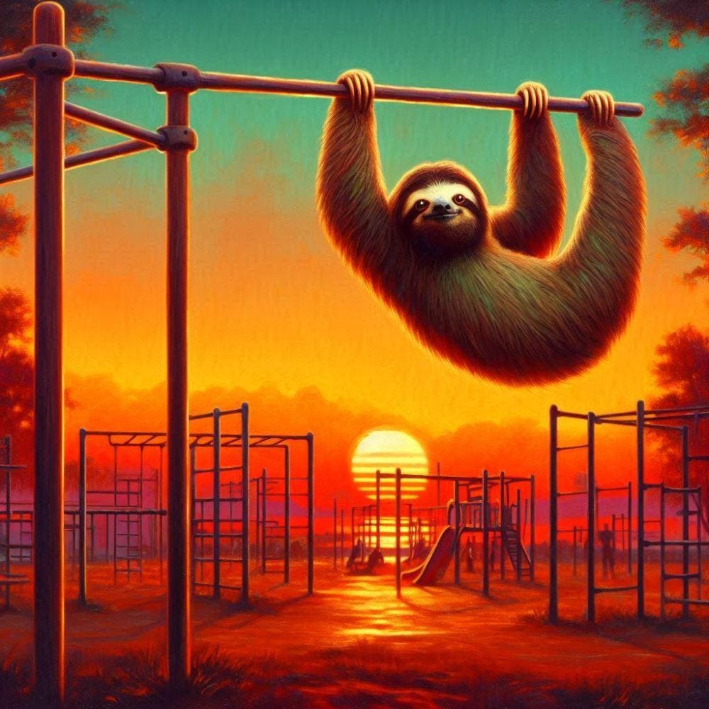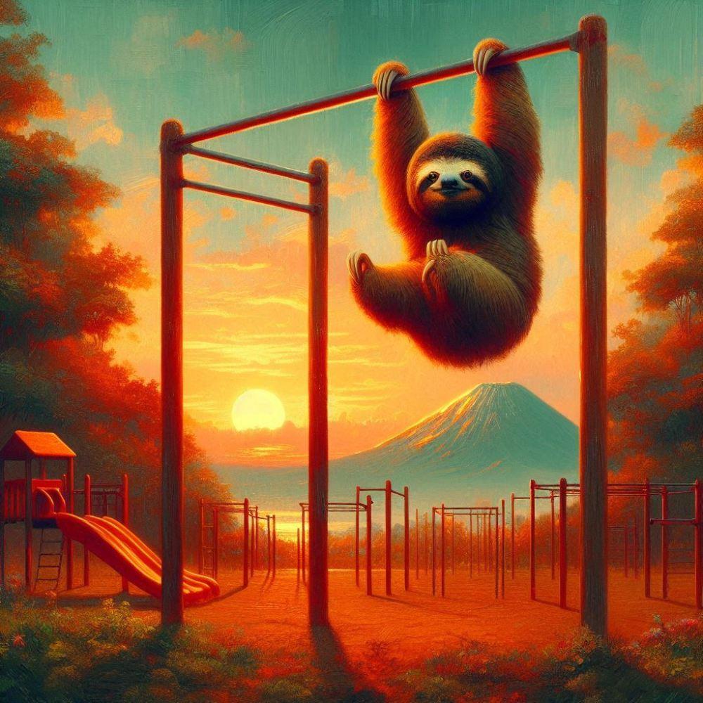 油絵ファンタジー、公園の鉄棒にぶら下がる懸垂ナマケモノ