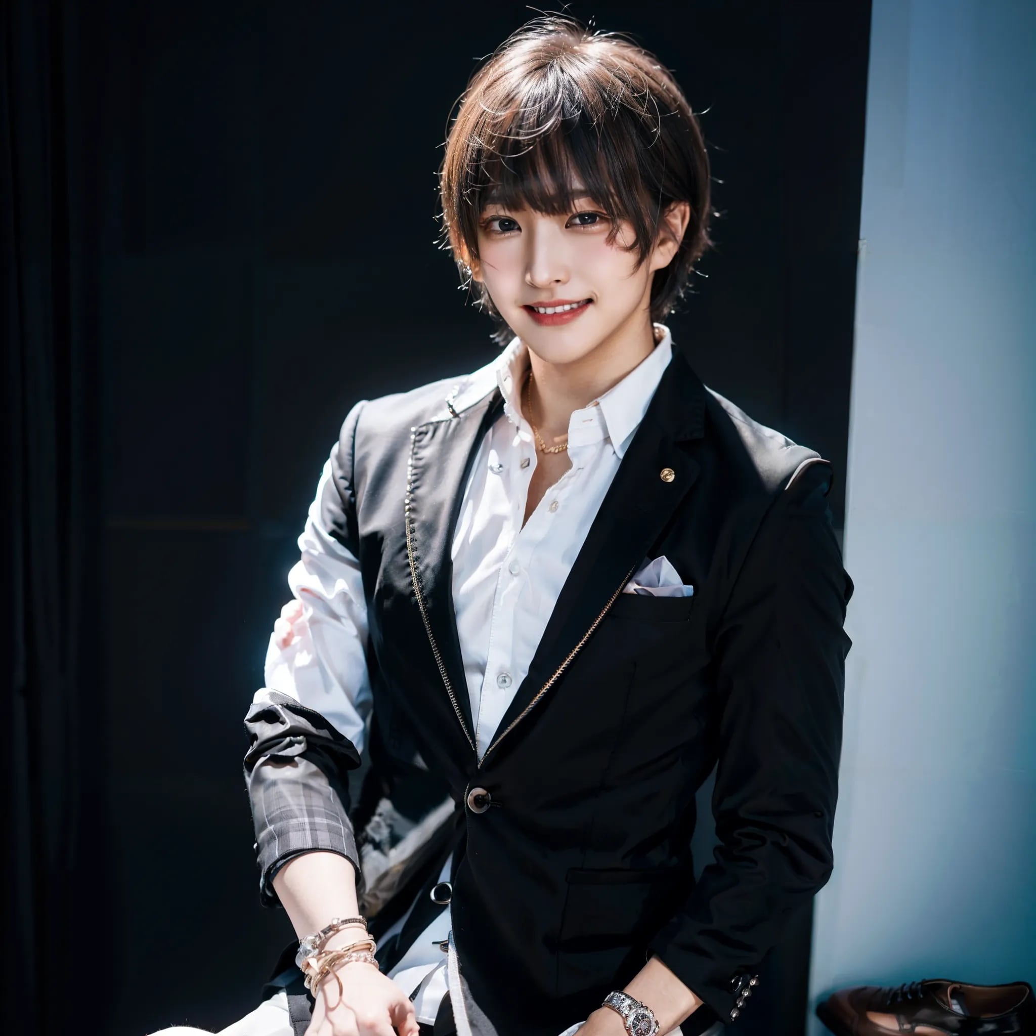 BREAK (濃色のブレザー:1.7)、(白シャツ:1.6)、(グレーのスラックス:1.3)、(黒のメンズビジネスシューズ:1.6)、
