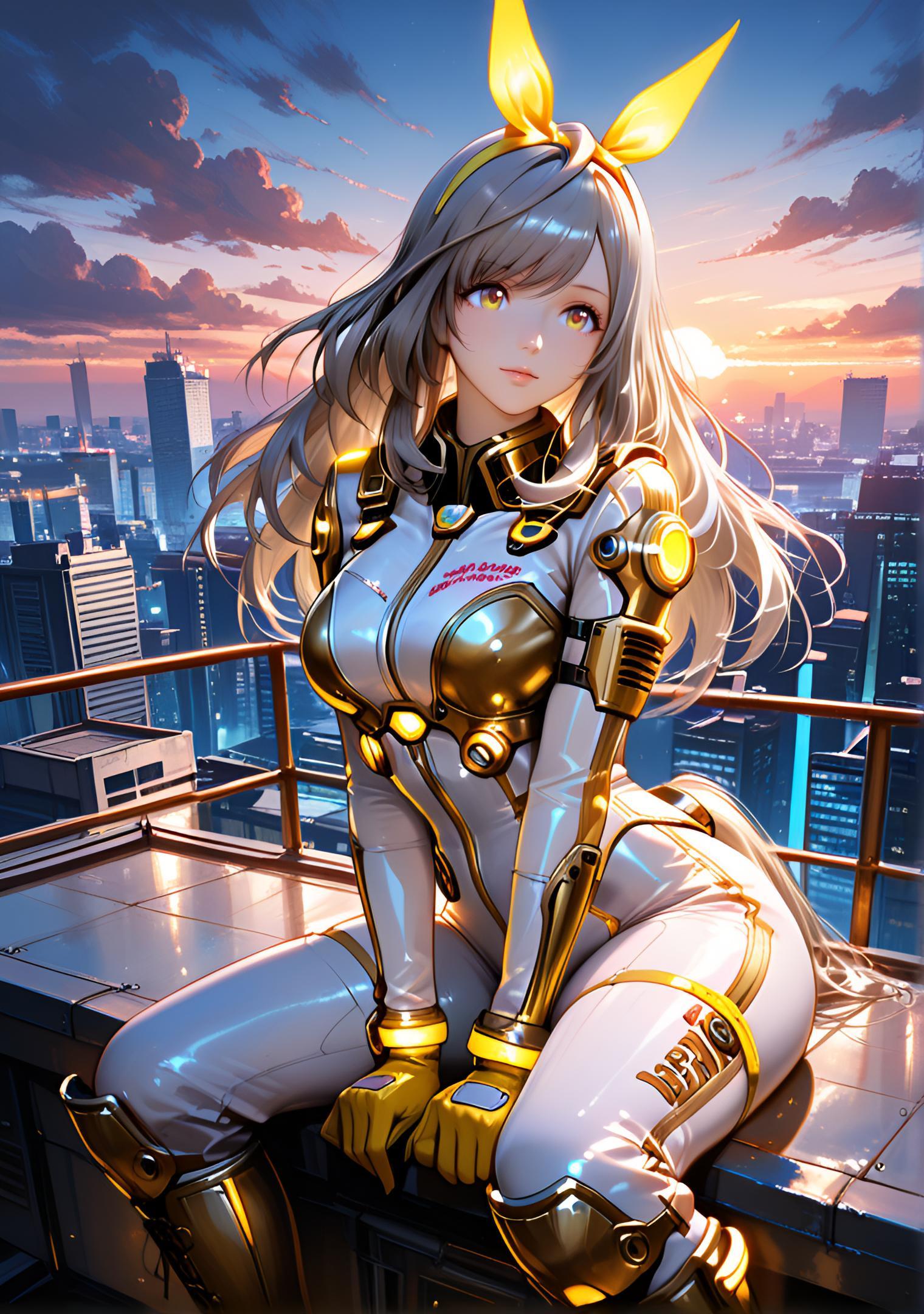- metallic silver bodysuit with gold accent lines, high-collared design, reflective armor plates on shoulders and thighs, golden visor helmet, luminous yellow energy core on chest # シルバーグロリアススーツ