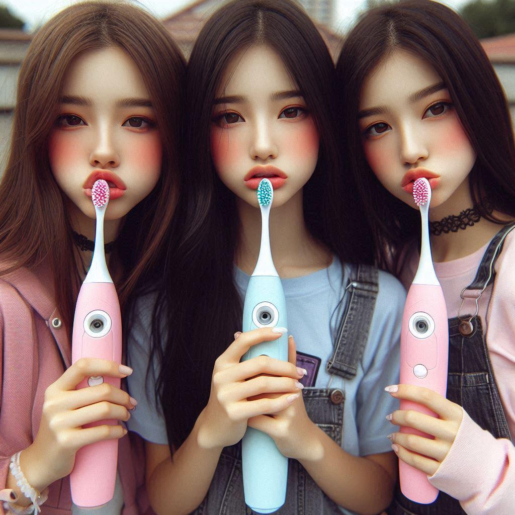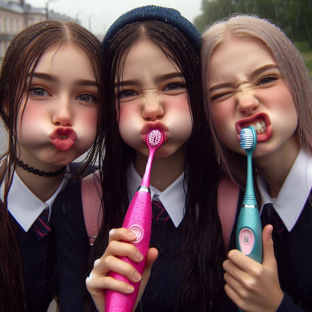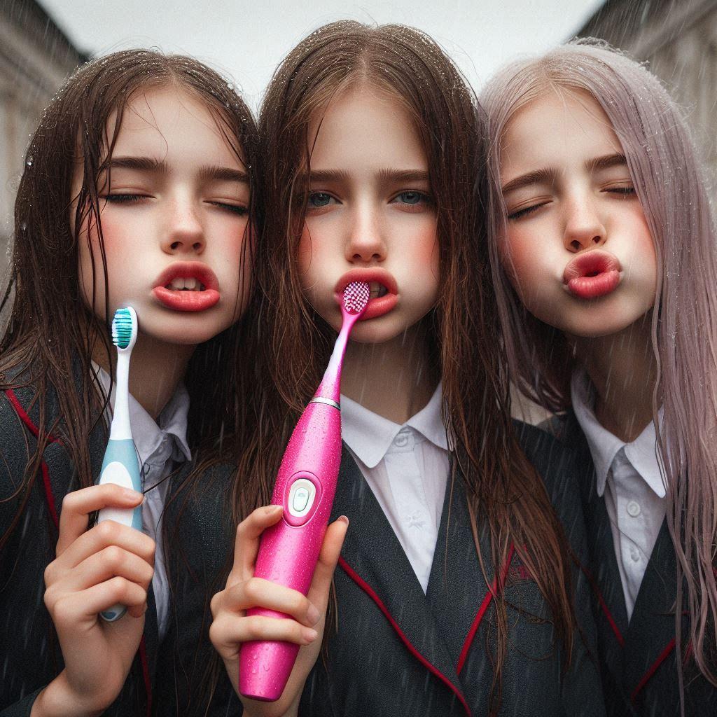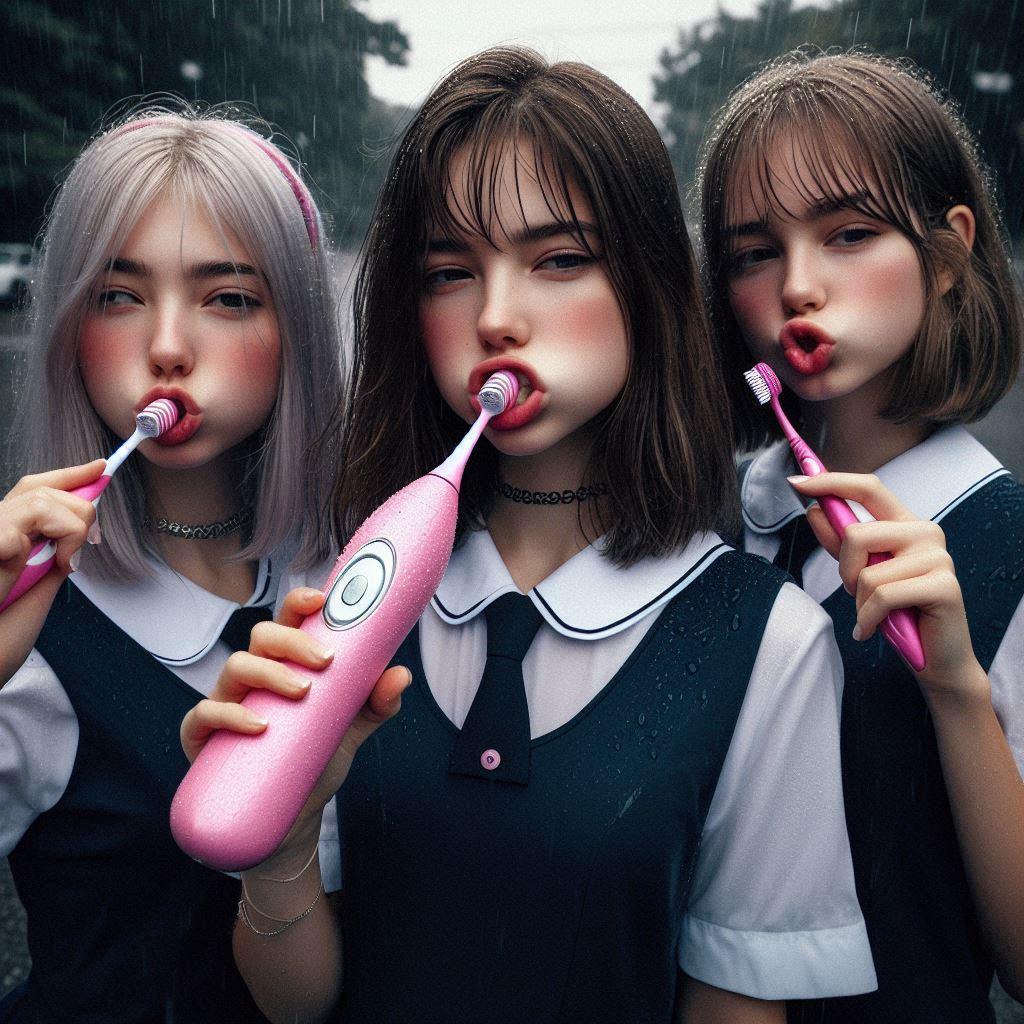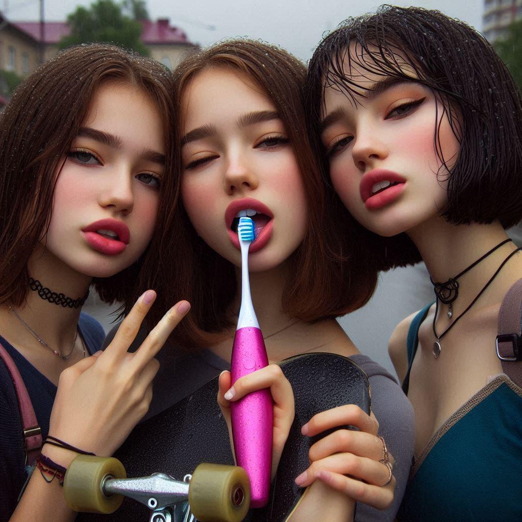 ロシア人の美人の小学生女子15歳三人がスケボーに乗りピンクの電動歯ブラシを頬をへこませながら唇で引っ張っている