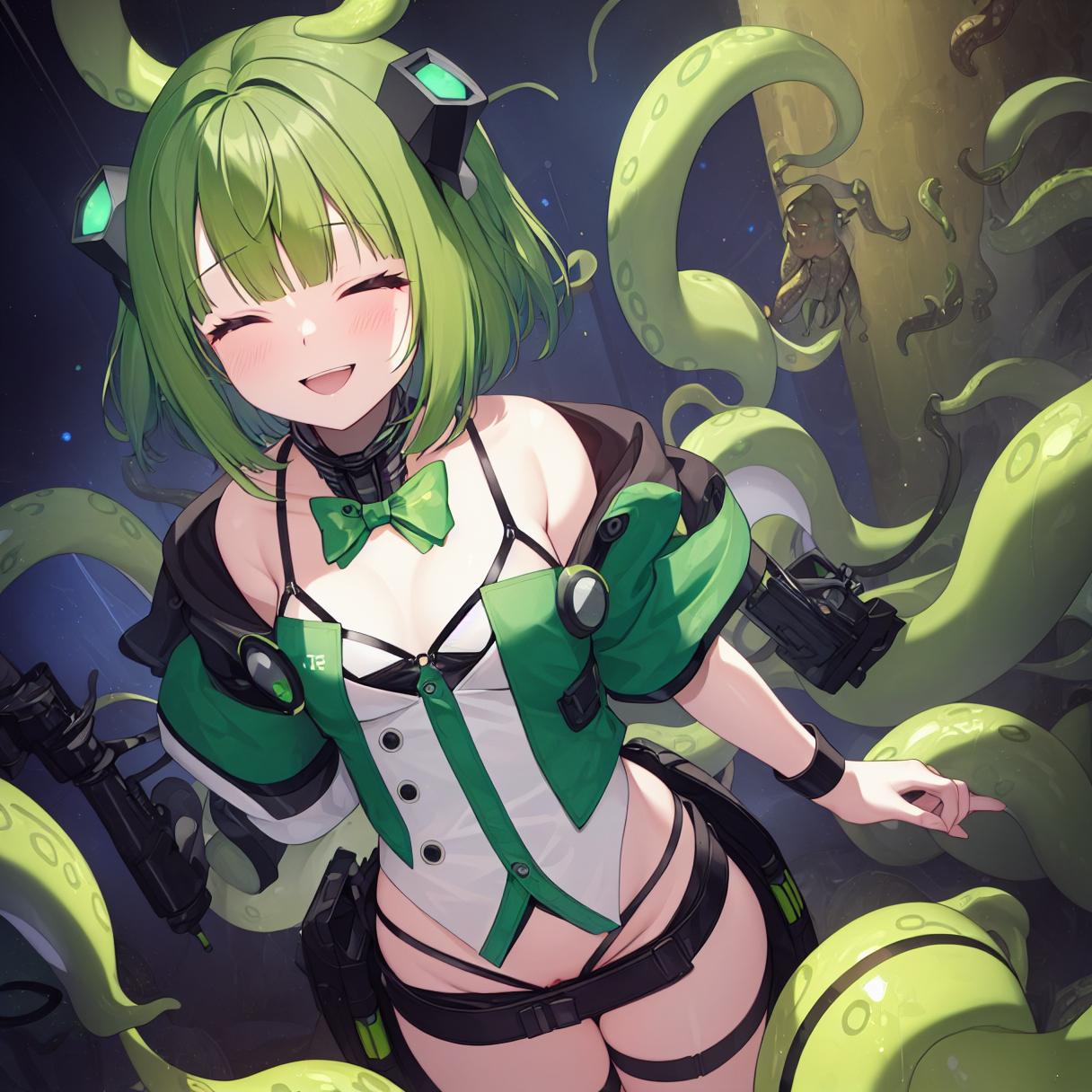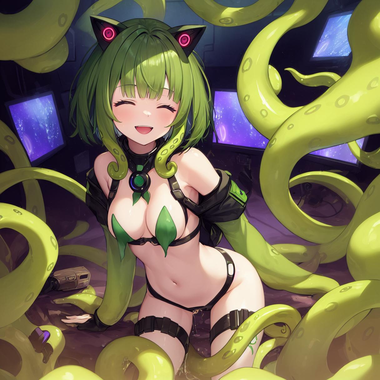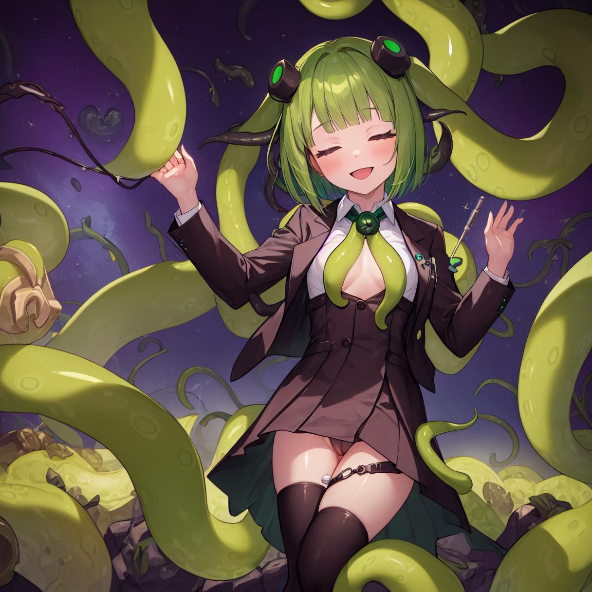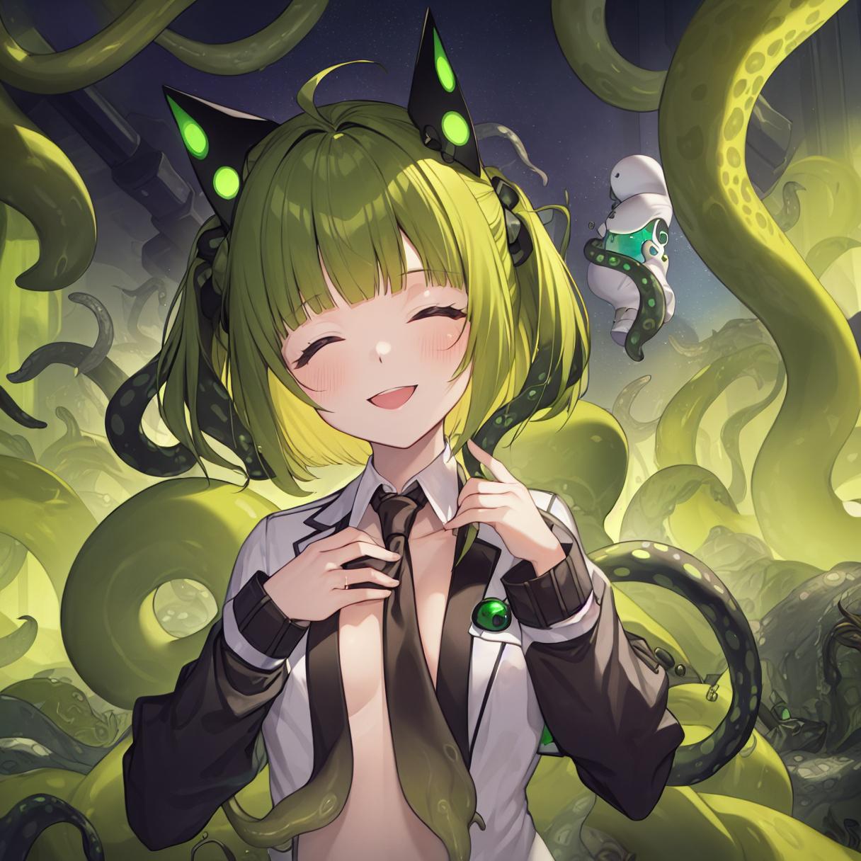 元の髪の色は茶色だが、触手と接続しているときは緑になる