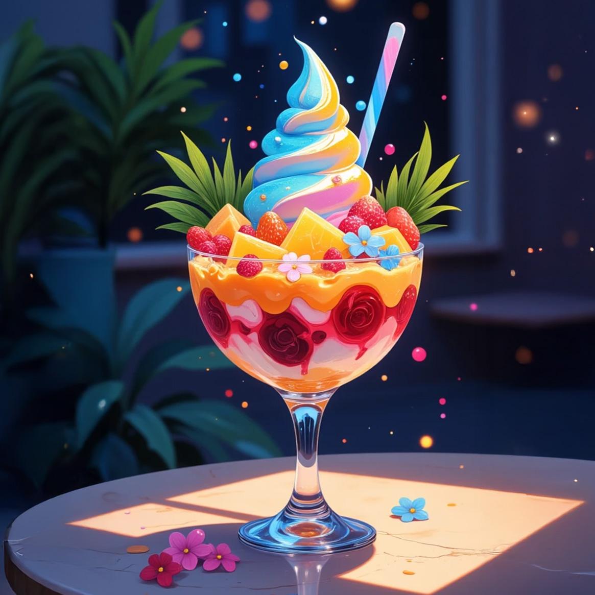 氷の粒を入れシャリ感を出したレインボーカラーのジェラートを乗せました