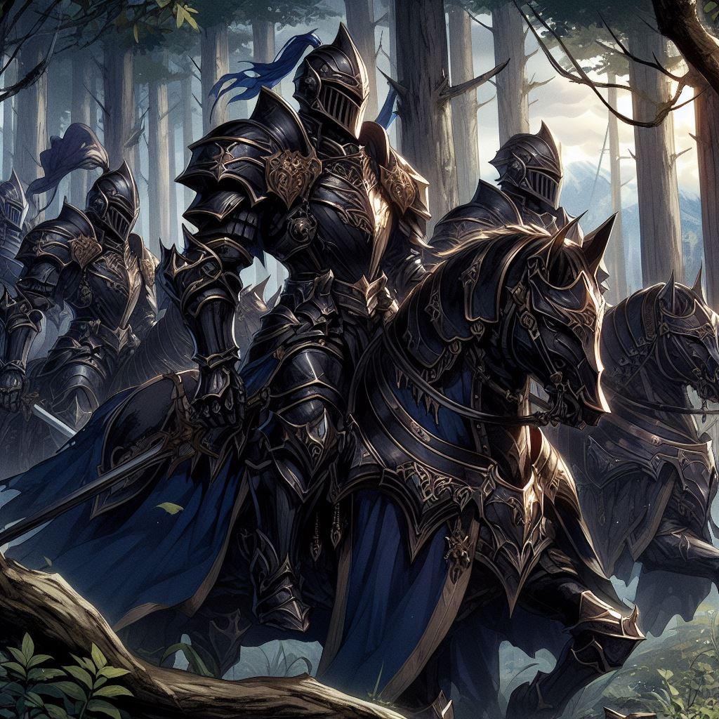 彼らの鎧は朝日の光を受けてきらめき、その影は森の中に長く伸びる。
