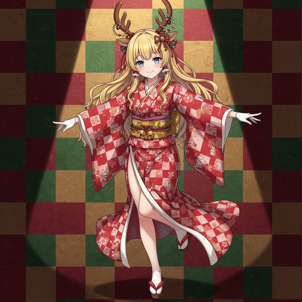 帯の上から鈴付きサッシュベルトを生成してくれたり、背景の市松模様が着物にも