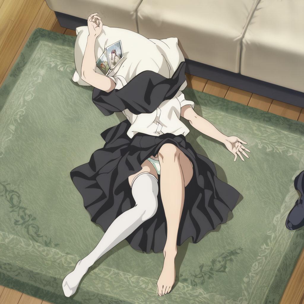 ゲームで、寝落ち。ストッキングを片方だけ脱いで、まぶしいから枕で頭を隠しているようだ。ベットまで行けずに床でダウン。