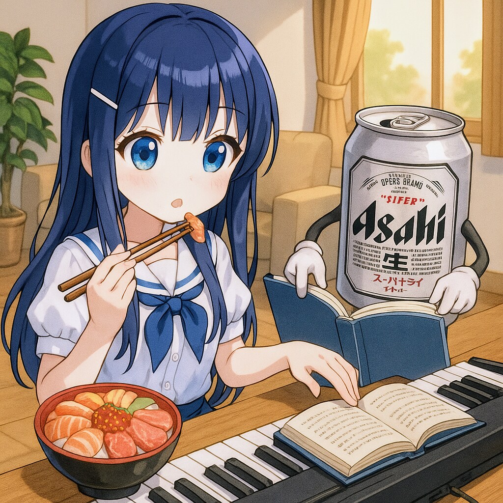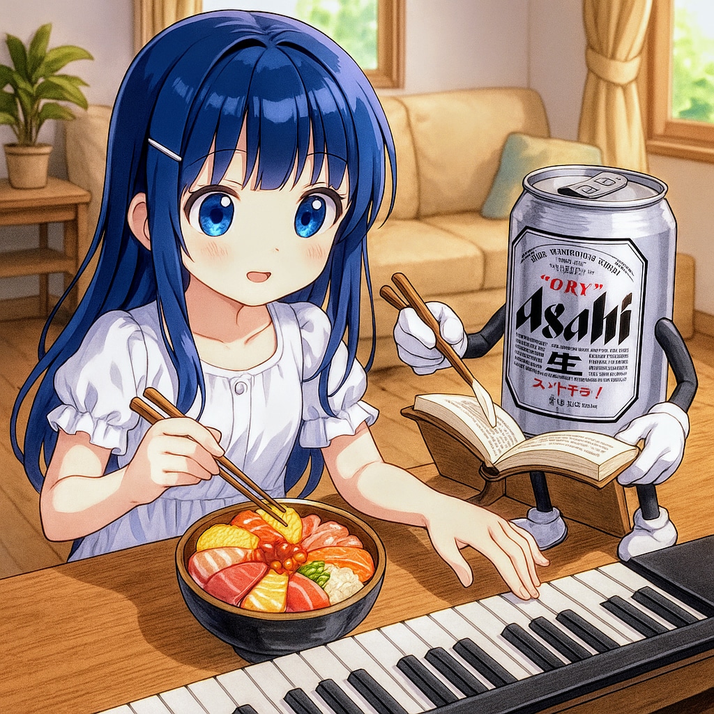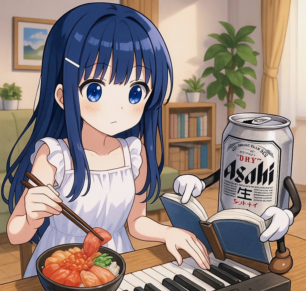 ピアノを弾きつつ読書しながら海鮮丼を食べるチサちゃん