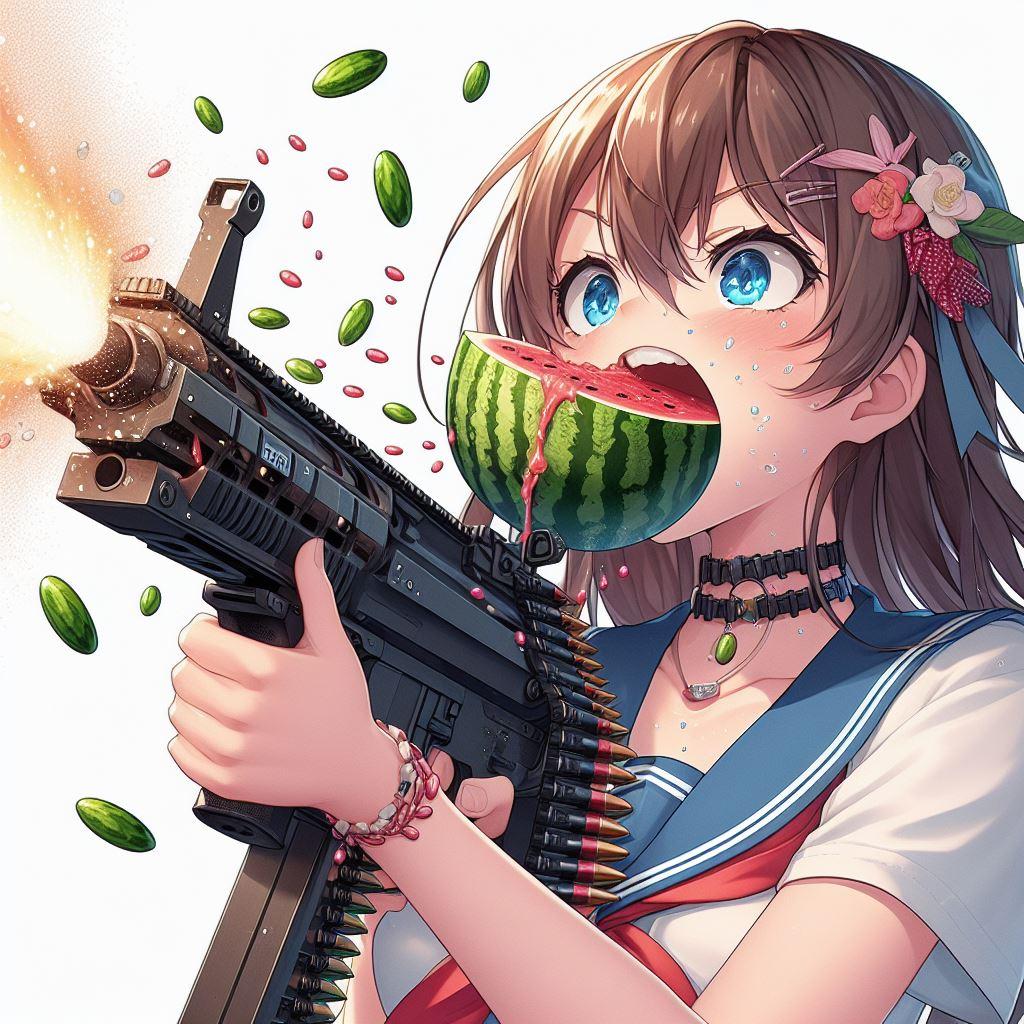 女子高生にスイカの種をマシンガンの如く、口から発射させようとして失敗した画像