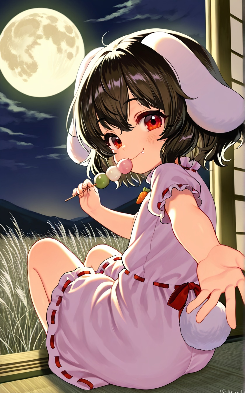 これはプロンプトにちょっとAIピクターズさんのお題「お月見」に関するワードを入れていたせいか画風がちょっと引っ張られている疑惑のあるてゐちゃんです。
