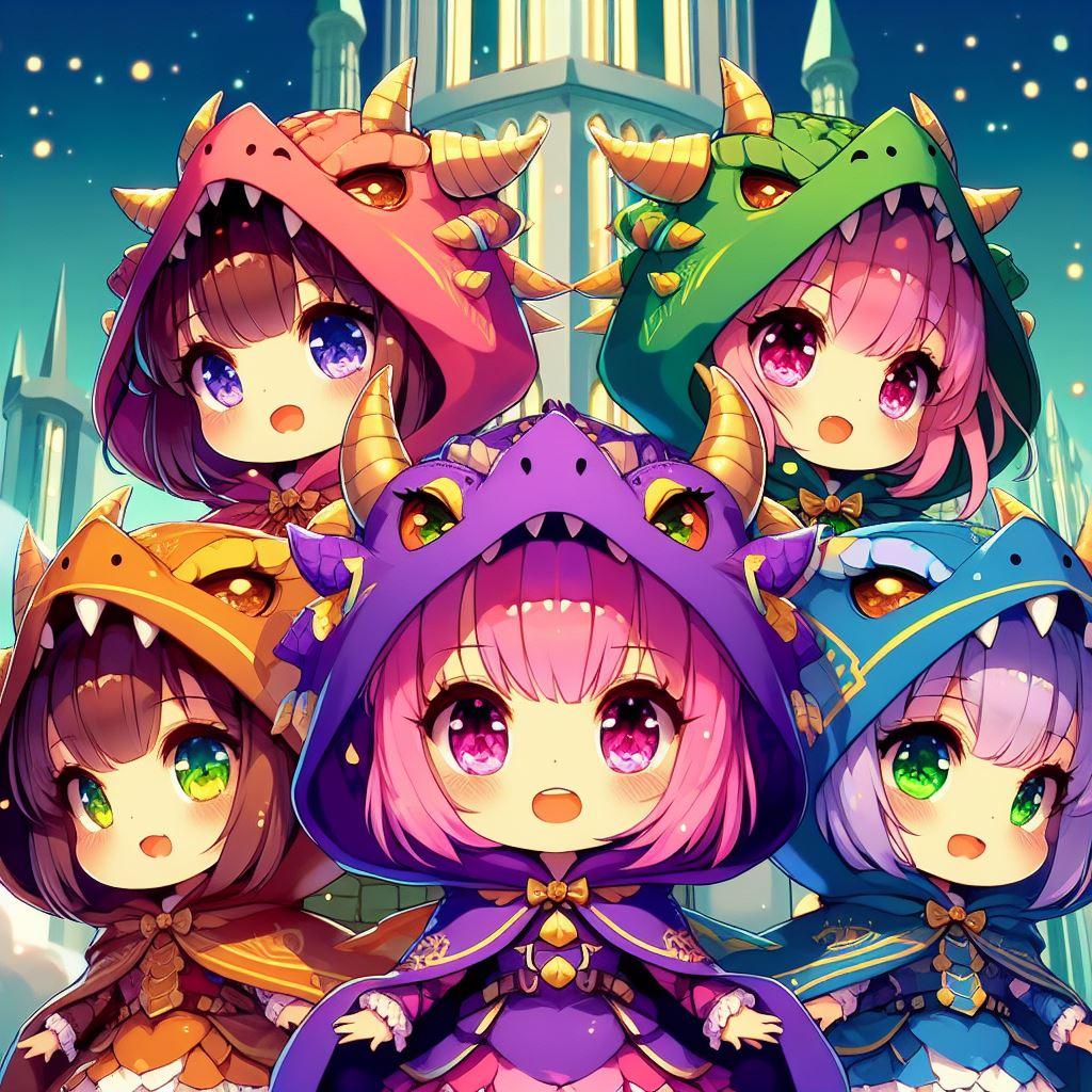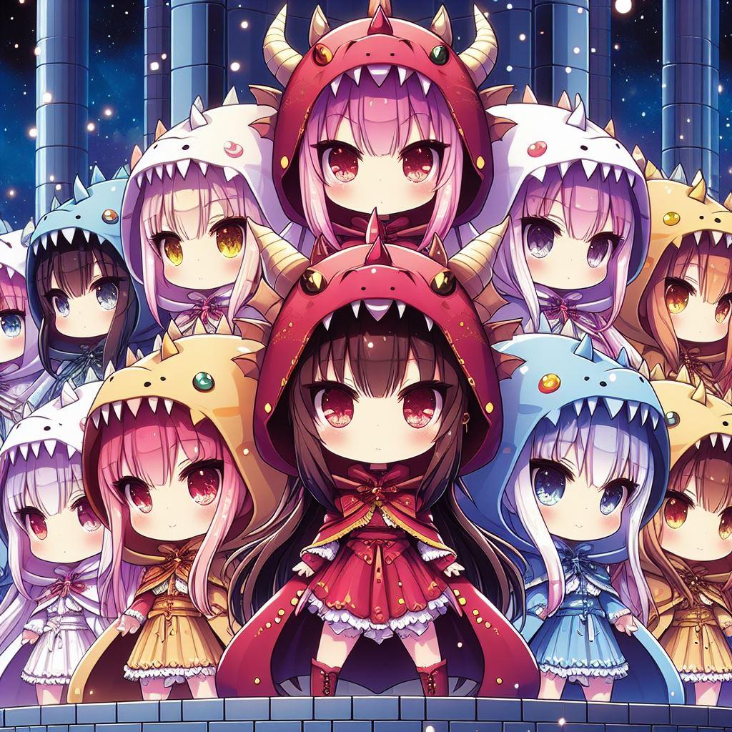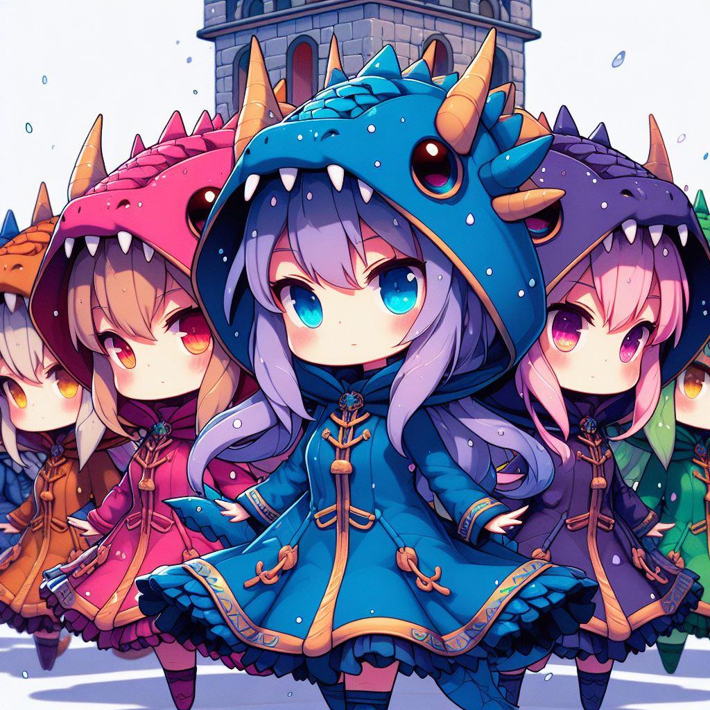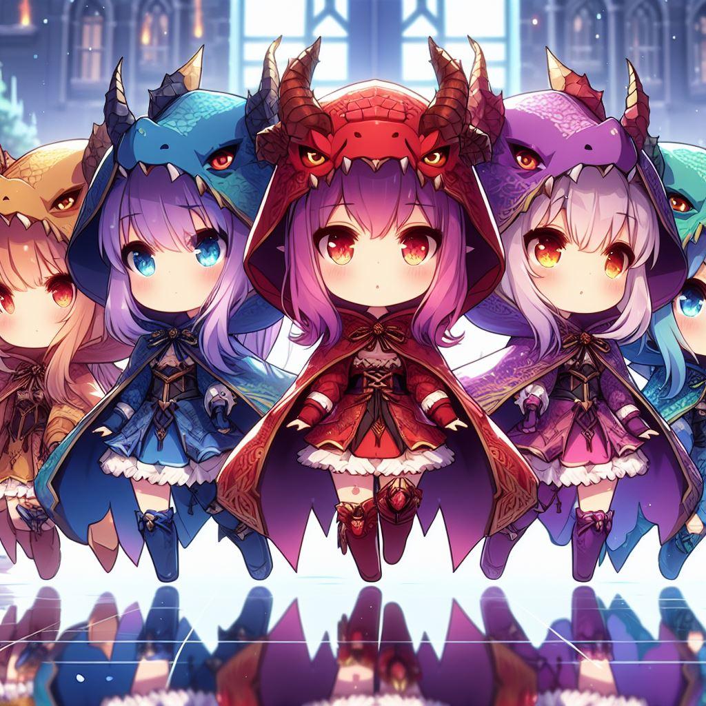 ドラゴンの色、ポーズを全員違わせて多人数のドラゴンガールを生成しました