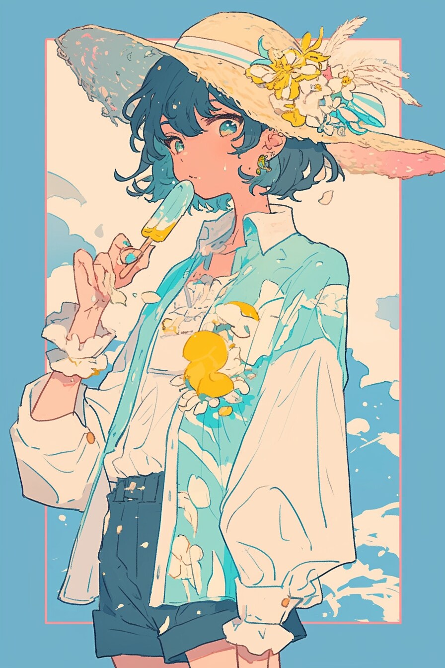 タグ: 夏 女の子 麦わら帽子 アイスキャンディ 青髪 清涼感 夏の装い 花飾り イラスト 涼しげ
