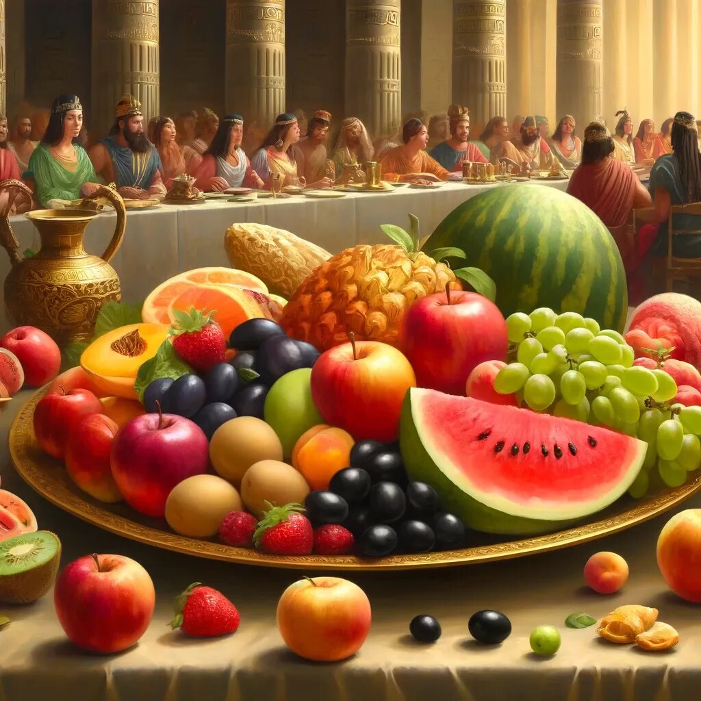 料理も無難にフルーツ盛り合わせにしときました。古代エジプトで食べられていたと考えられるフルーツを並べ立てています。
