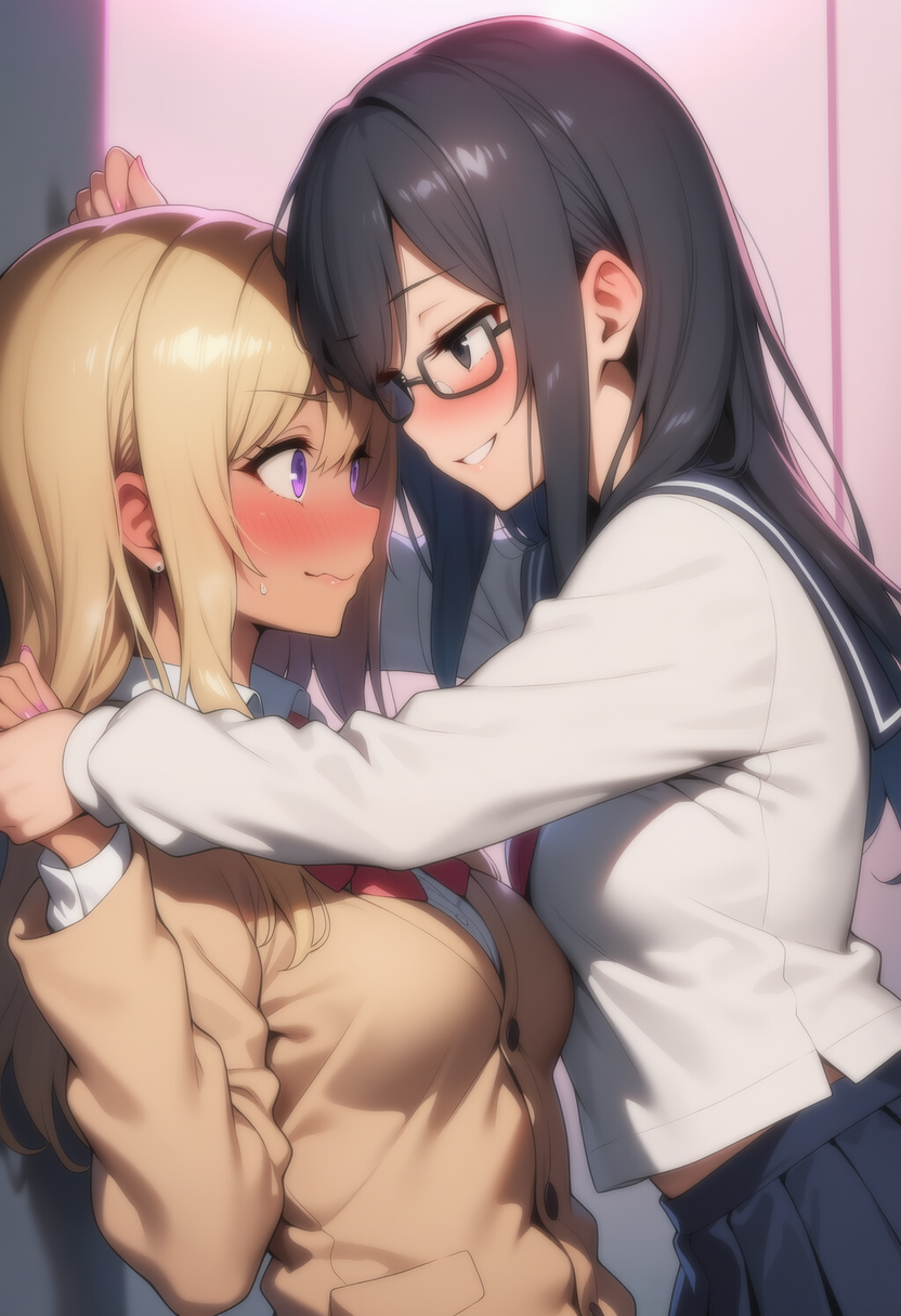 girl, gyaru, medium breast, purple eyes, brown skin, blonde girl, long hair, {{{embarrassed}}}, blazer, target#grabbing wrist