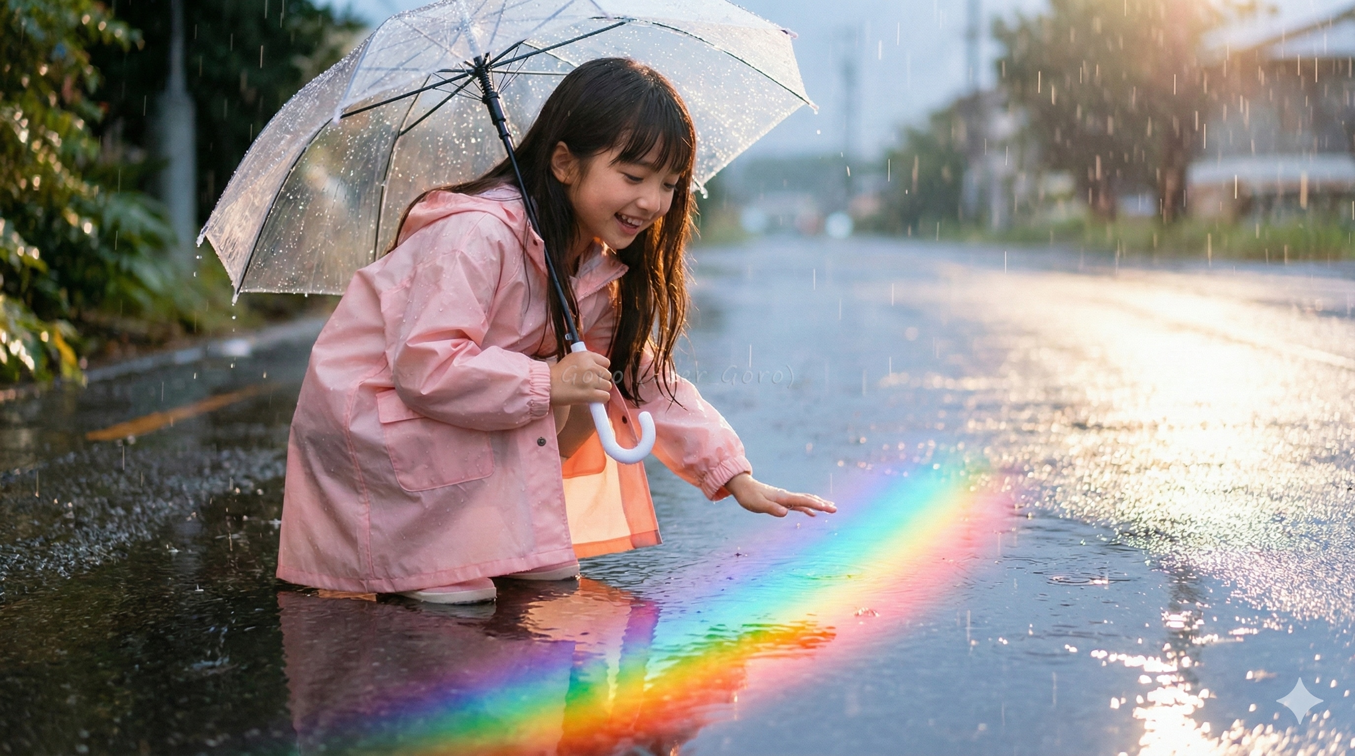 空を見上げて虹を見つけた少女が、ふと足元を見たらそっちにも虹が映っていることに気づいてしゃがみ込んだ、というシーンだそうです。