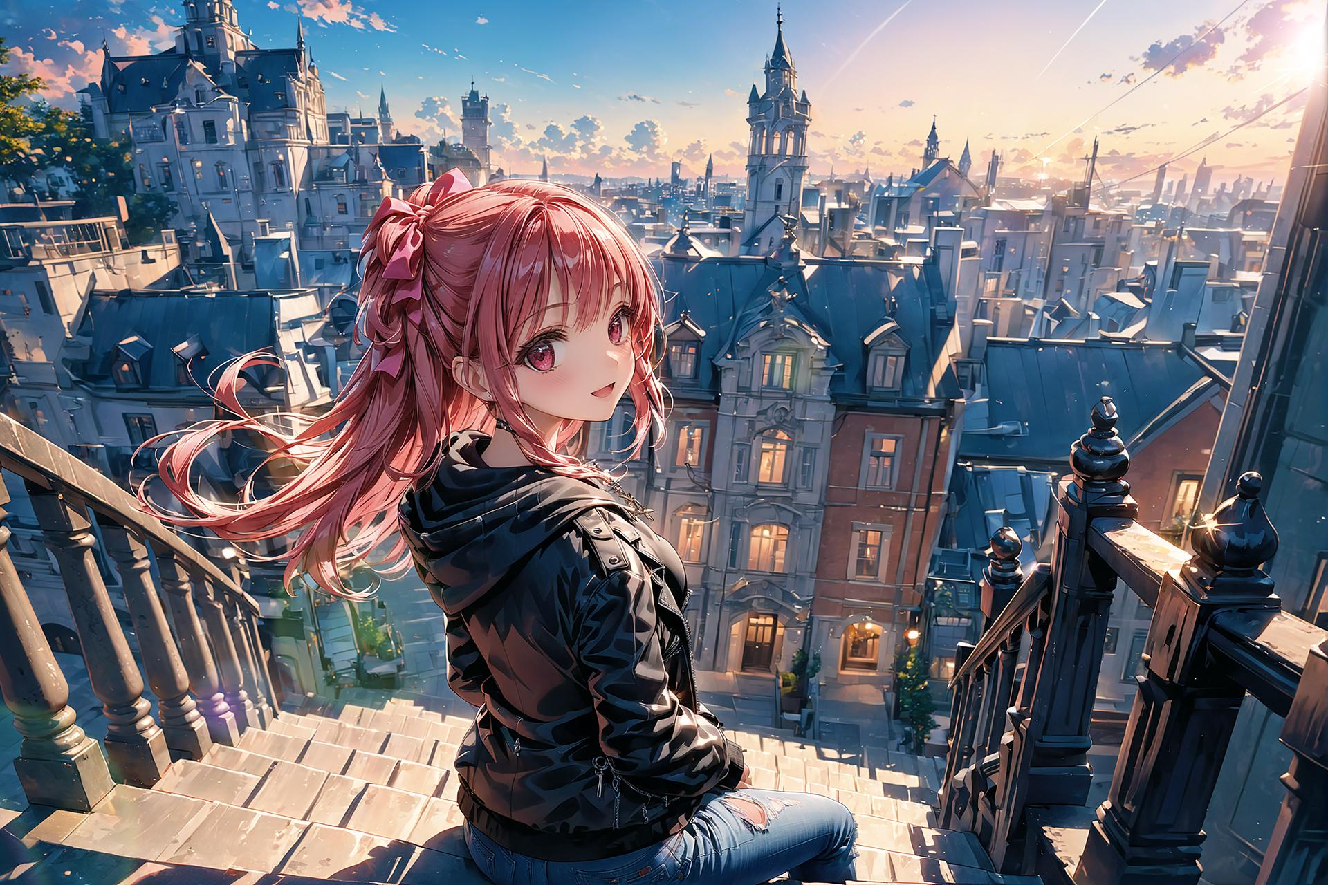 まるで古い映画のワンシーンのように、街を見下ろす高台の階段に腰かけ、淡く染まった空を背にして、こちらに振り返ったその笑顔は、どこか懐かしく、そして痛みを孕んでいた。
