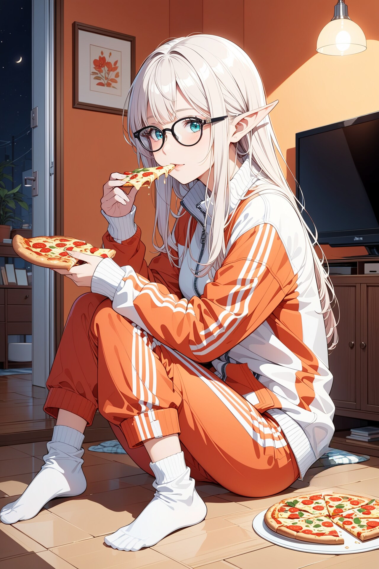 なぜか判らないけど、この時期は近所のスーパーでピザが安売りしていて、ご満悦な普段着のエルフさんです。