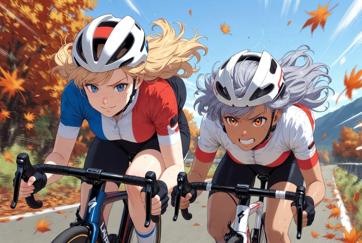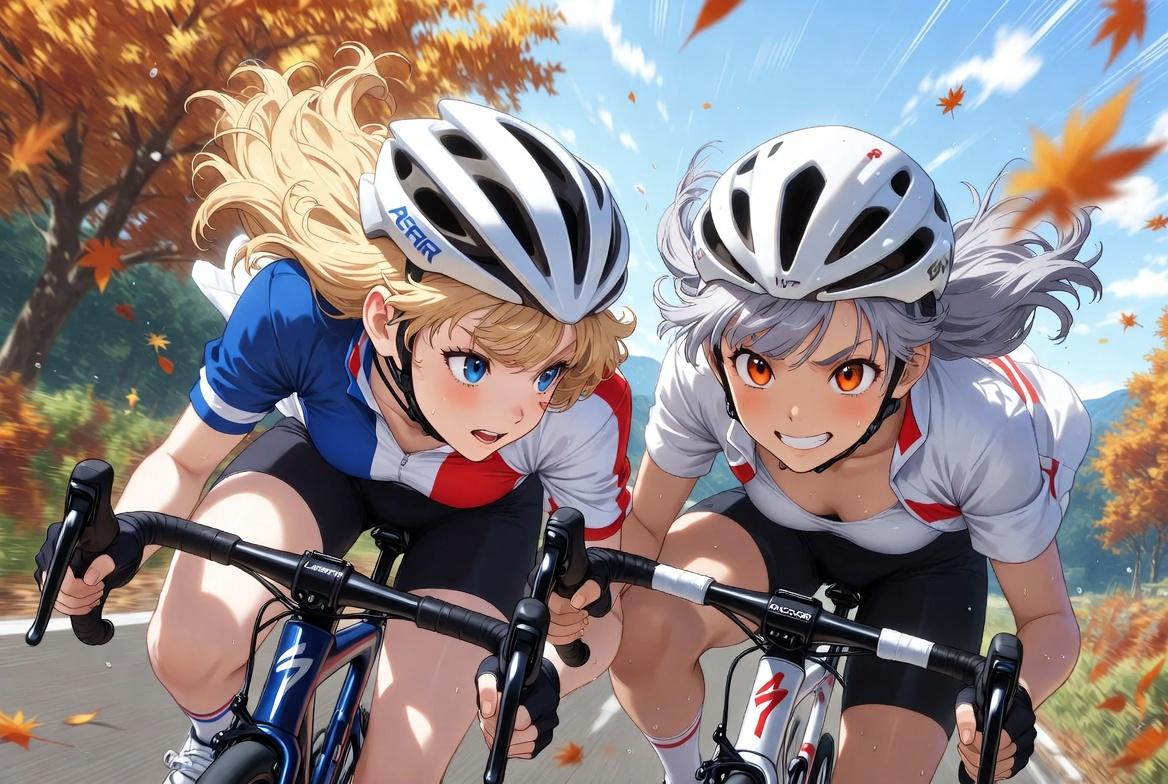 6・7枚目 Grok:動画前提だからか、とにかくキャラの表情や仕草が良い。絵柄も一番現代的で修正の必要を感じない。自転車の描写は他の二者の中間レベル。構図がほぼ固定で、ロゴのたぐいは読めない不思議文字になる。高確率でヘルメットを脱いじゃうし、ジャージが風でなびいてしまうのもよろしくない。ホクロはたまに描いてくれるがデカすぎる。しかし解像度は一番低いはずなのにそれを感じさせない精密感がある。個人的には優勝。