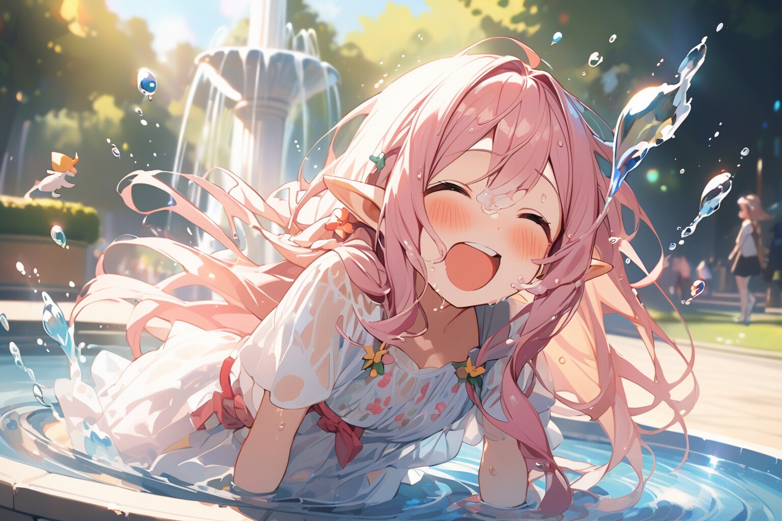 「エルフの幼女が公園の噴水に落ちて、びしょ濡れになってスケスケのまま、笑っている」