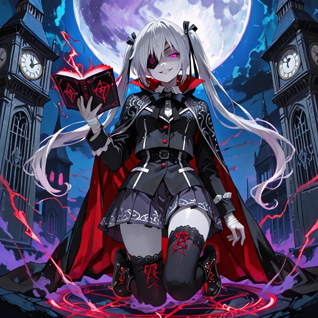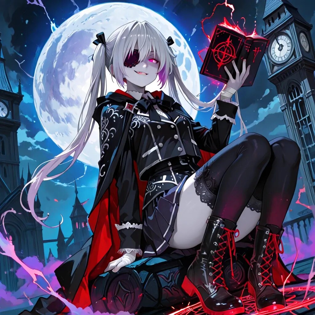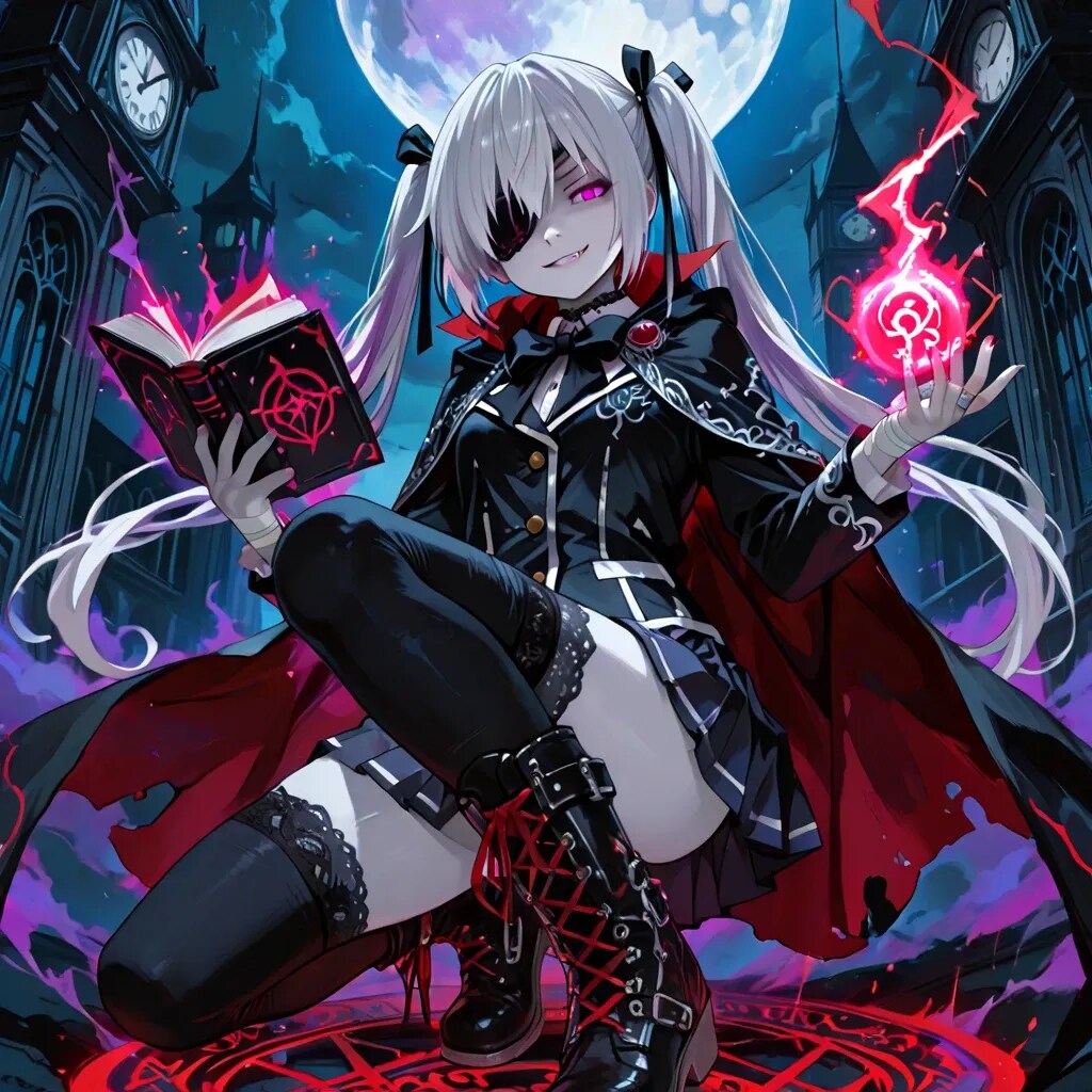 眼帯、マント、禁書などを黒主体で追加しつつ、我慢できずに太もももチラリです。