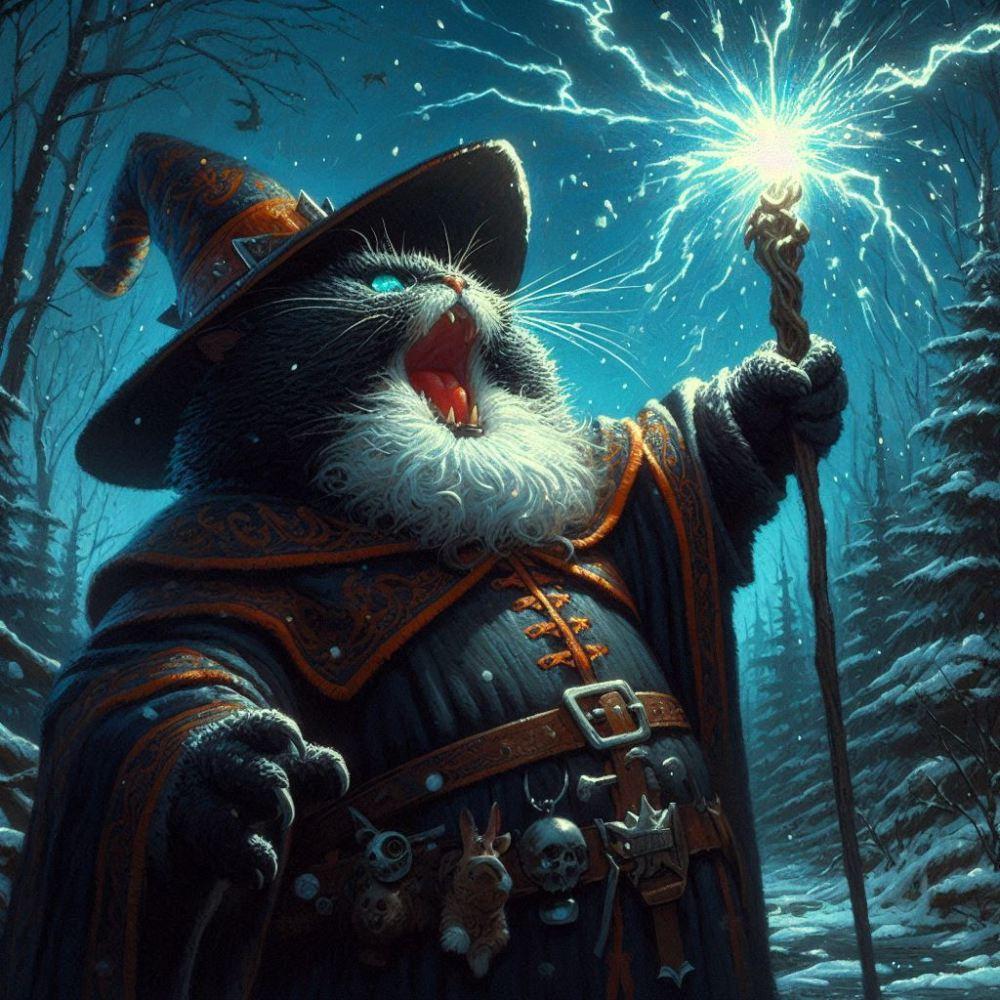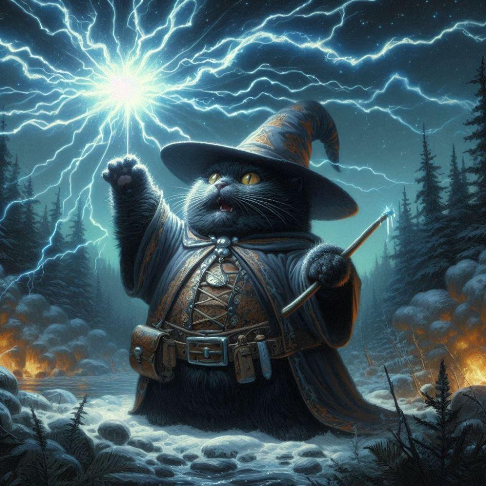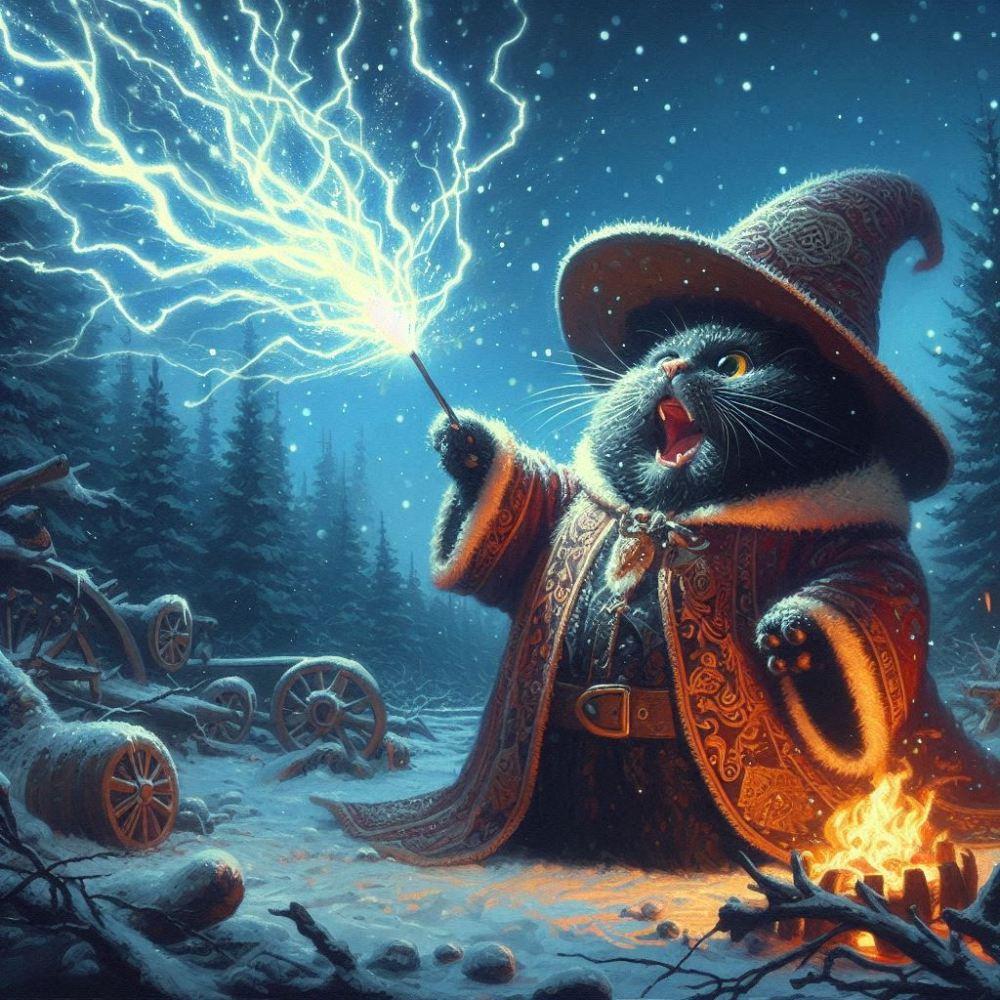 油絵ファンタジー、魔法使いコスプレ黒猫の魔法詠唱