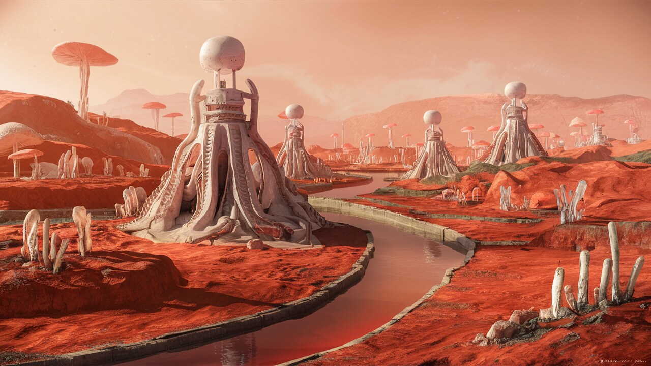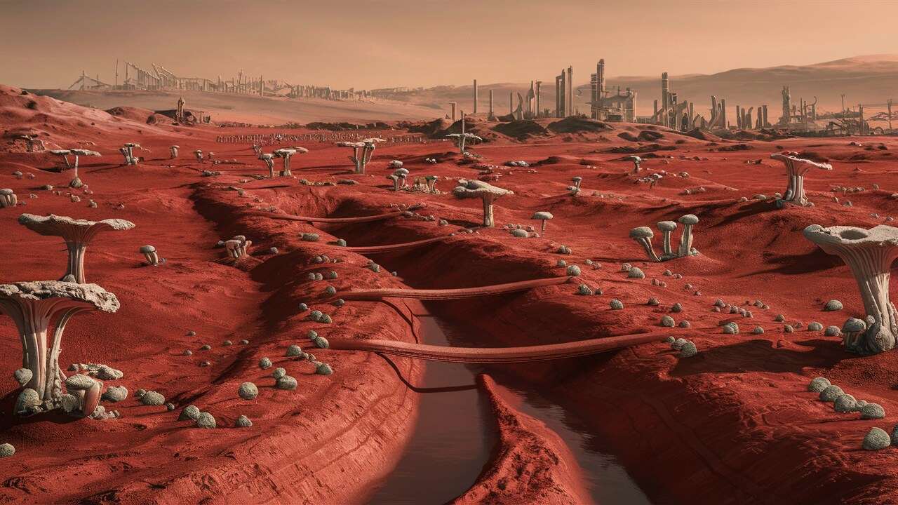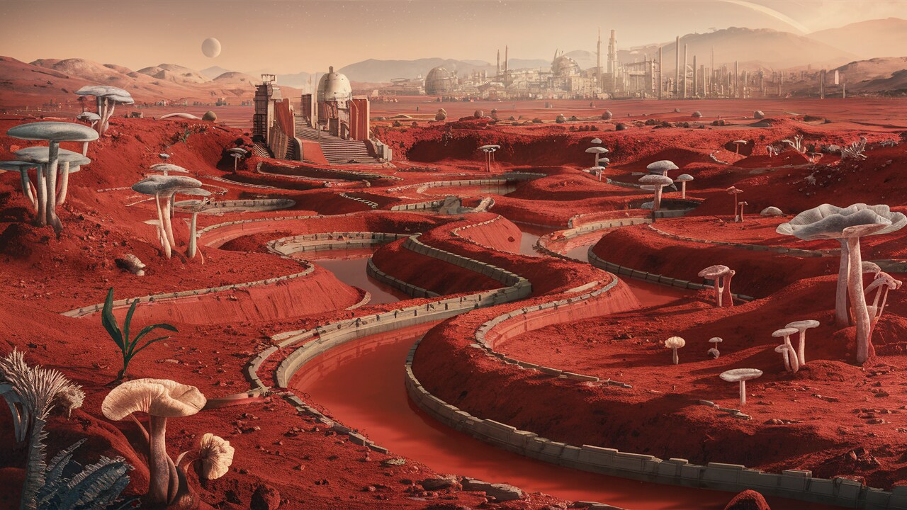 オリジナルプロンプトは「Ancient Martian civilization, canals, red soil, mushroom-like plants」