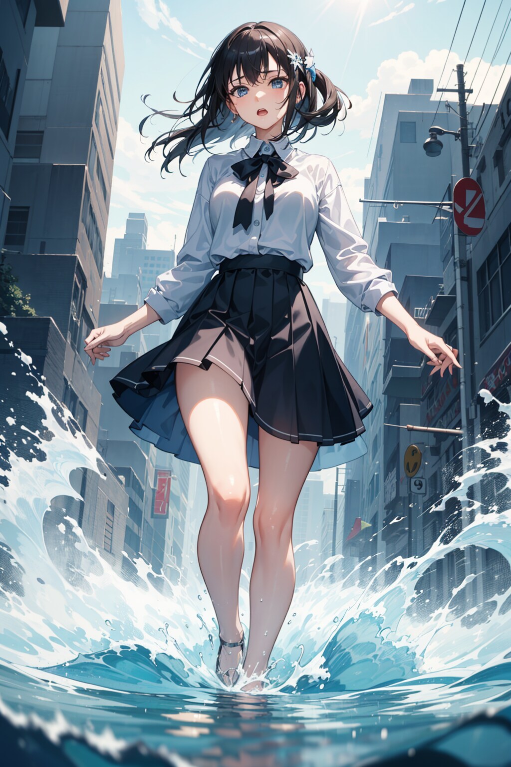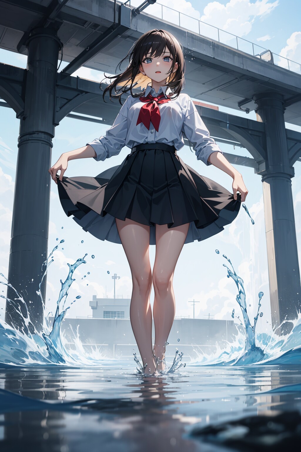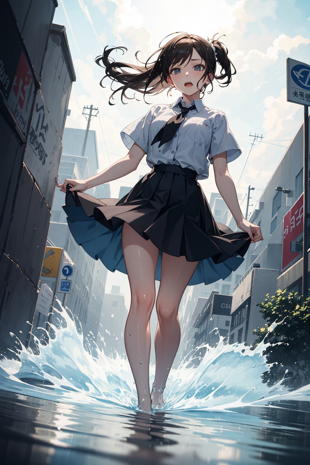 彼女は覚悟を決め、スカートが濡れないように気をつけながら、浸水した道を進んでいく。
