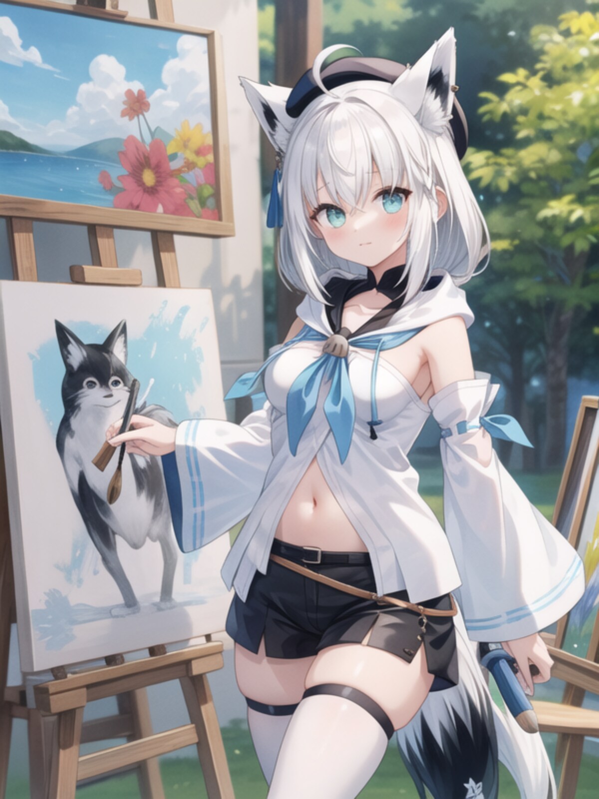 芸術に目覚めた白上フブキ様が筆を持ち風景画を描いているイラストをみたいんご!
