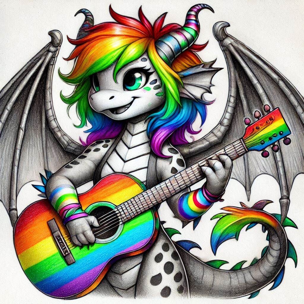pencil-drawing, A rainbow dragon girl is holding a rainbow guitar.