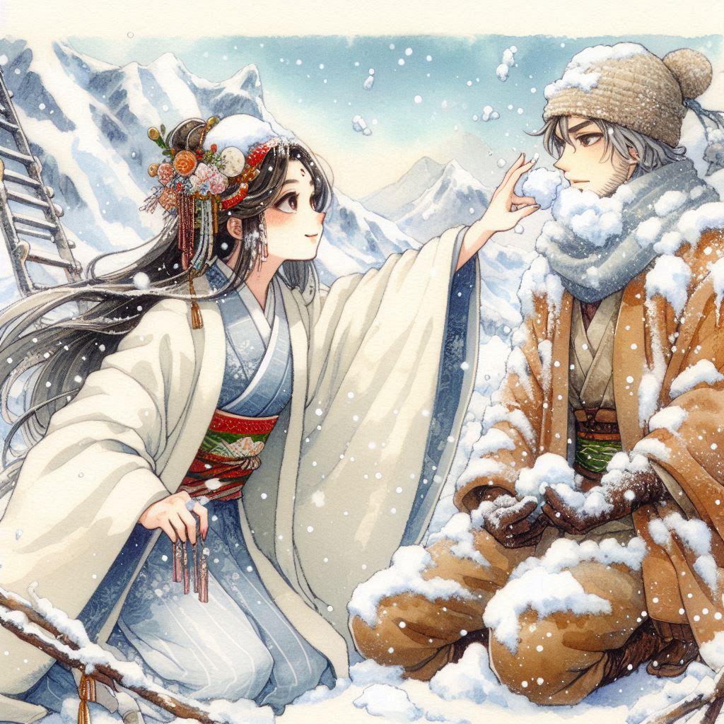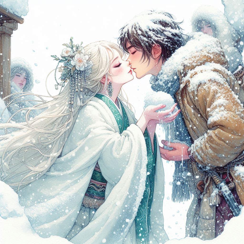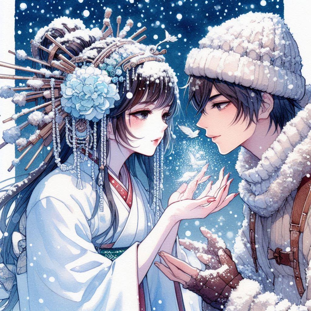 村の若者と恋におちた雪女ちゃん💖♪(同志捧げる男女物の恋愛イラスト)