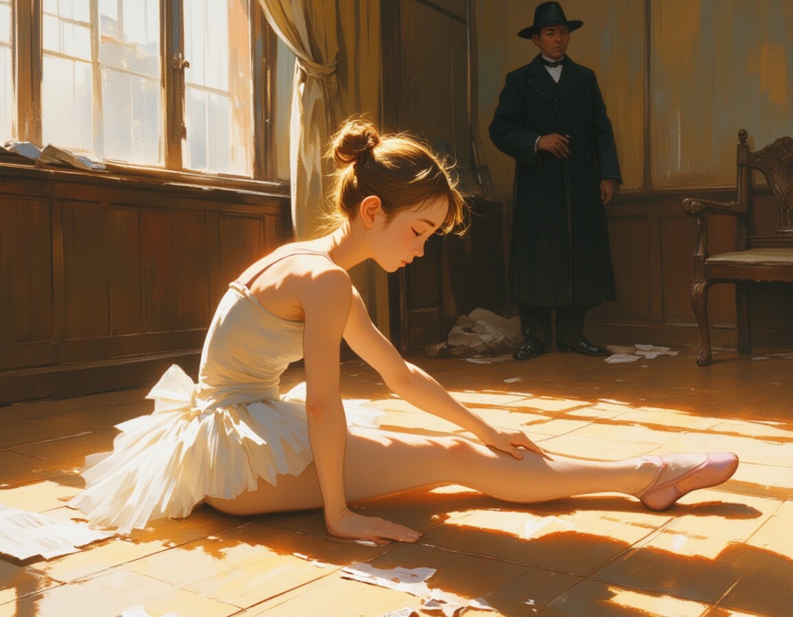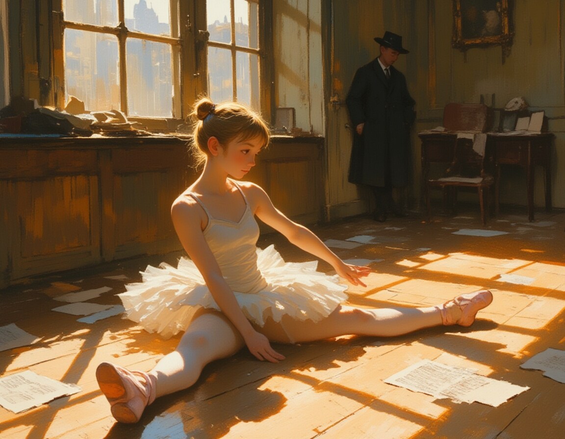 In the foreground,a young ballerina sits gracefully on the floor,performing a straddle stretch with poised precision. Her legs extend wide,her fingertips reaching toward one foot as she carefully deepens the stretch. Her delicate white tutu,slightly frayed at the edges,spreads around her,catching the subtle glow. Her pink pointe shoes show signs of wear,and her golden hair is neatly tied back,with a few loose strands escaping as she concentrates on her movements. The textured oil strokes emphasize the softness of her form against the structured space around her.,