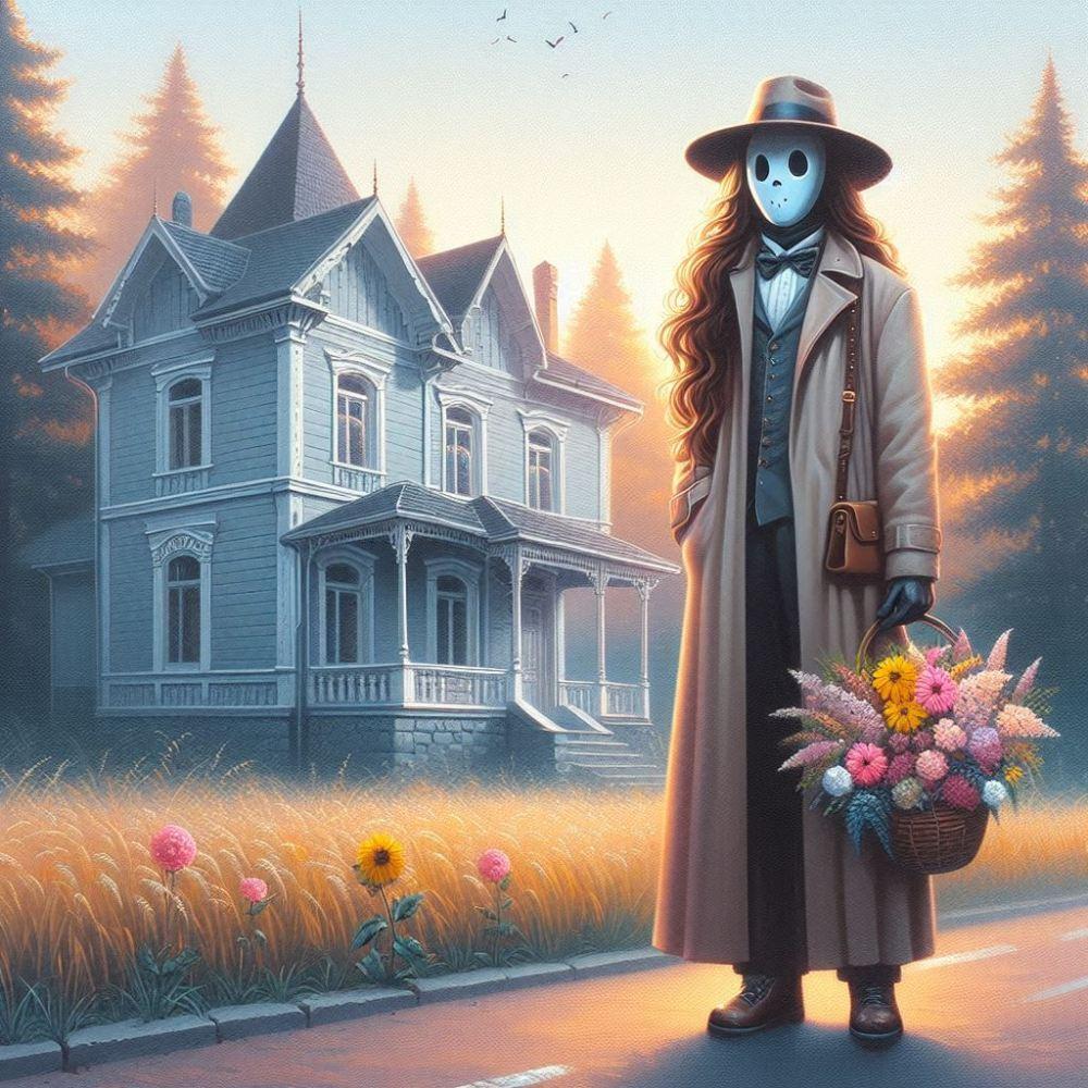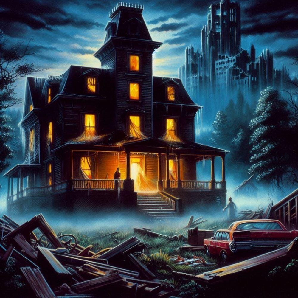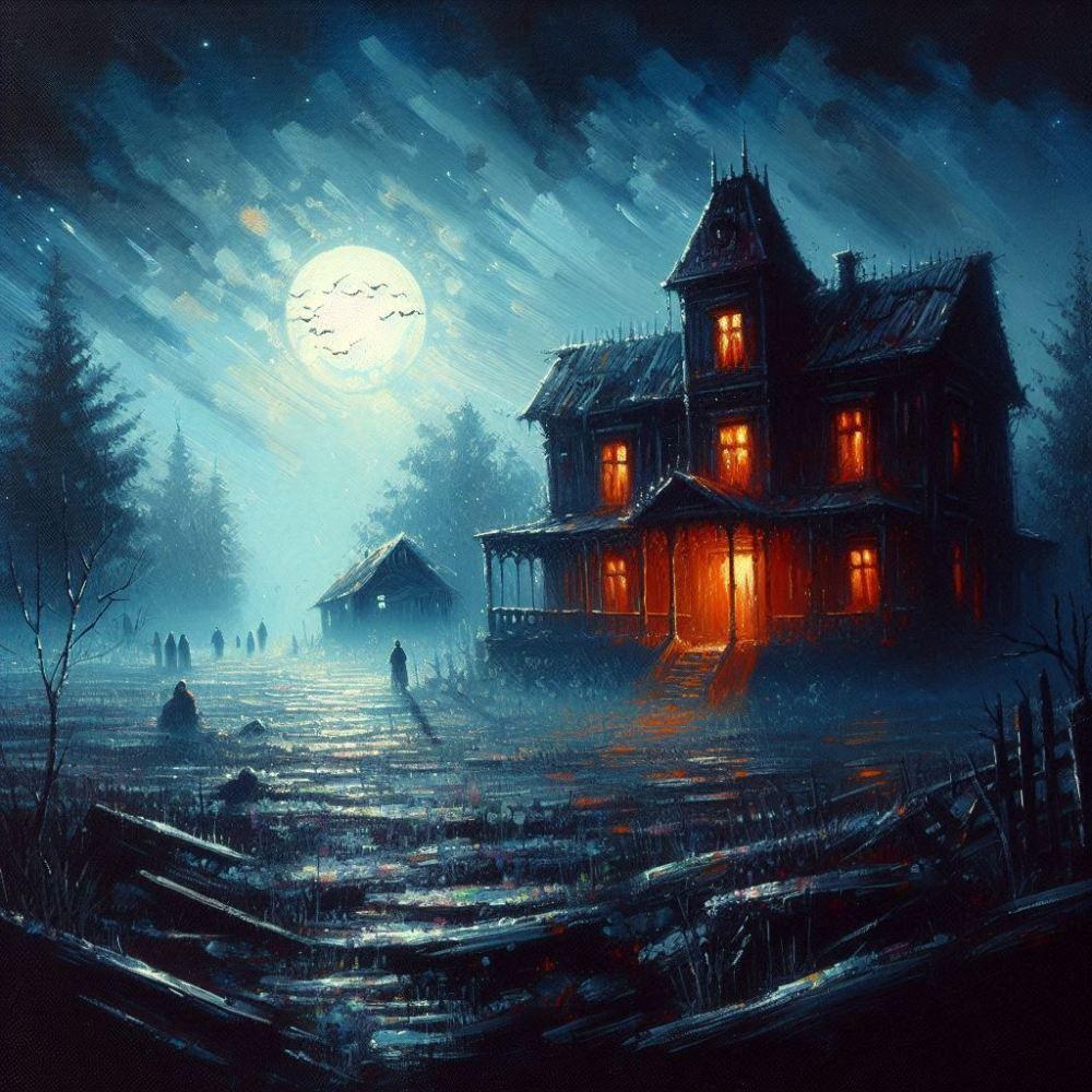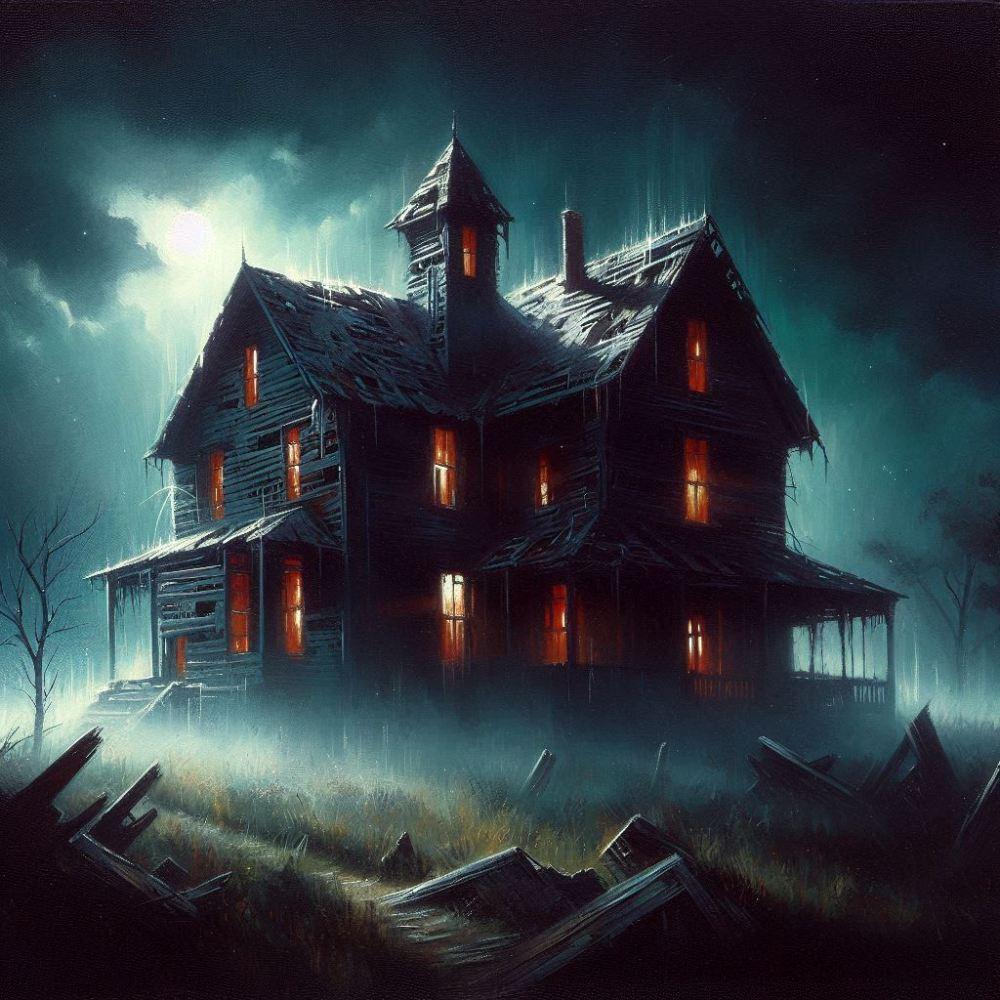 ホラー風アクリル絵 都市伝説のお化け 廃墟の館