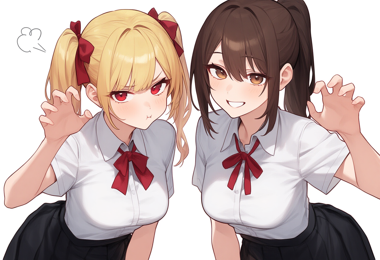 girl, blonde hair, twintail, white blouse, black skirt, red ribbon, red eyes, medium breast, closed mouth, claw pose,looking at viewer, pout