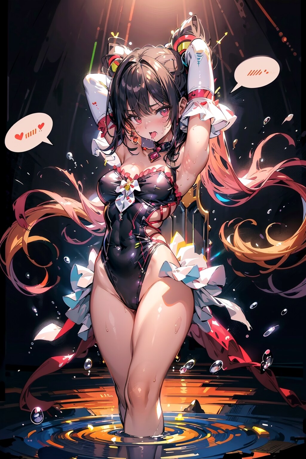 前置きが長くなりましたがw、そんな理由から”異空間”っぽい場所にいる美少女怪人をいつもの、やられ顔や変顔ではなく、綺麗な顔のままで”脇見せポーズやられ”って方向性で生成した次第です。