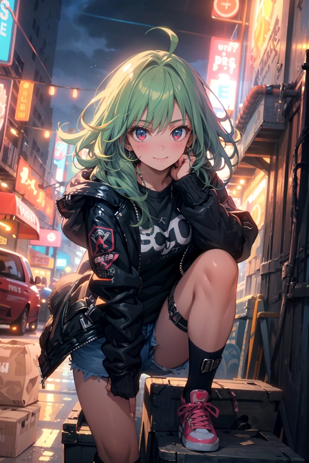 12月の年の瀬の投稿企画はここで #サイバーパンク だと聞いて!トレカシリーズに登場した緑髪の子のジュネットで、TOPAZモデルをベースに作ってみました。dynamic pose, dynamic angleの呪文を加えてストリート系でちょっと攻めた感じになりました。