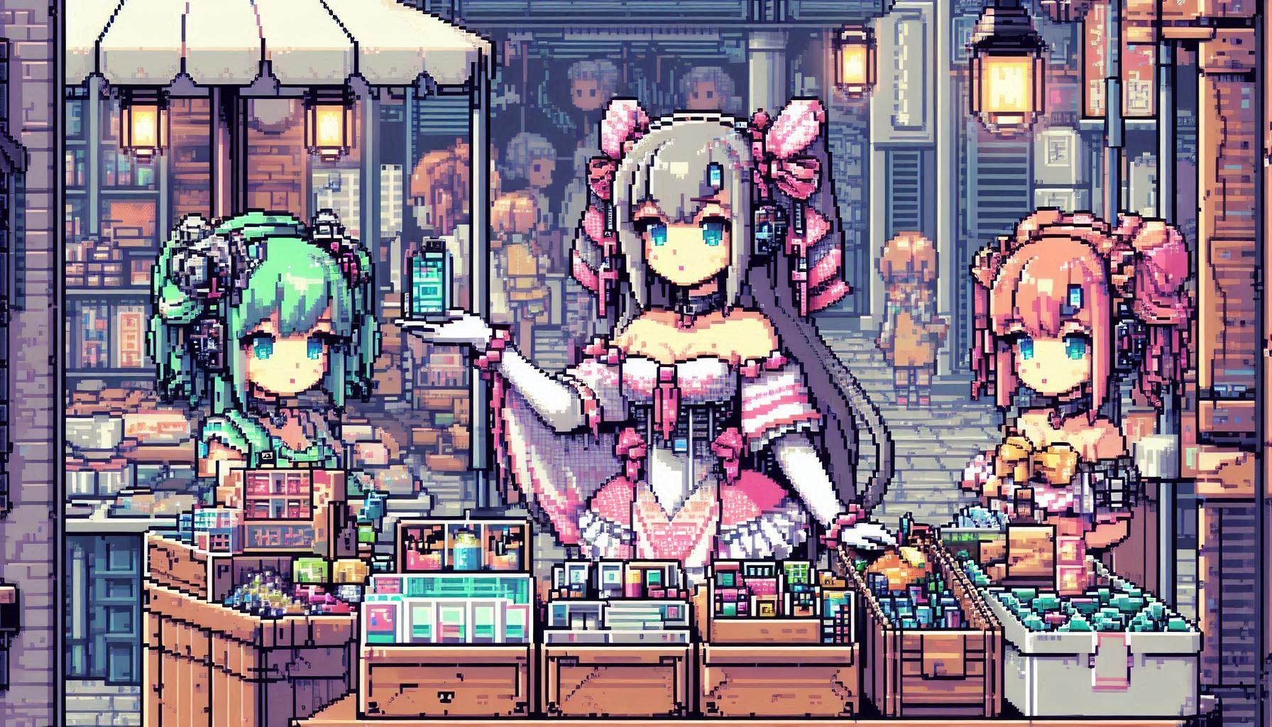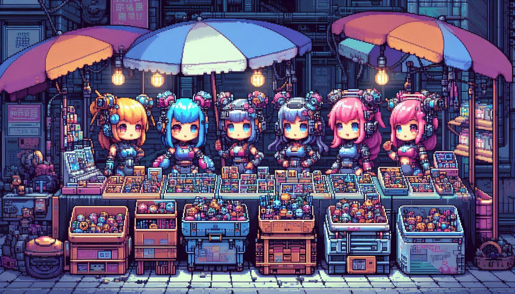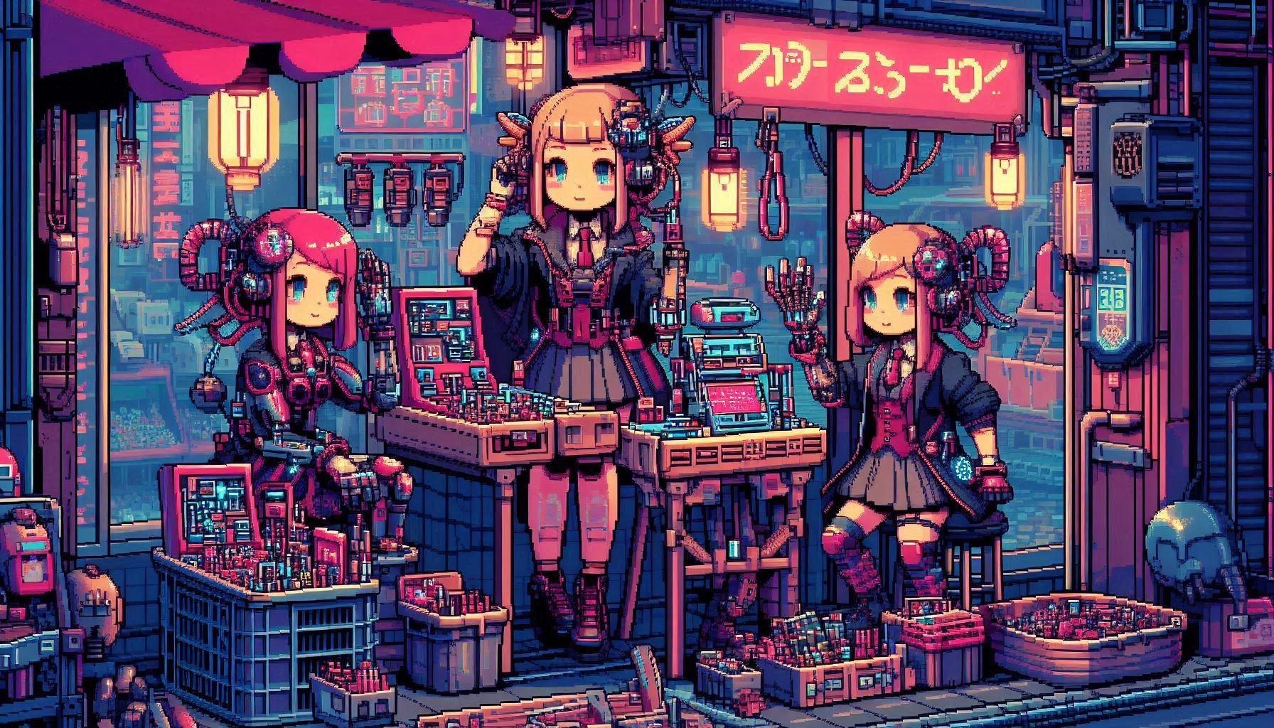 (ドット絵風)怪しいサイバーパンクなパーツ市場の露店♪