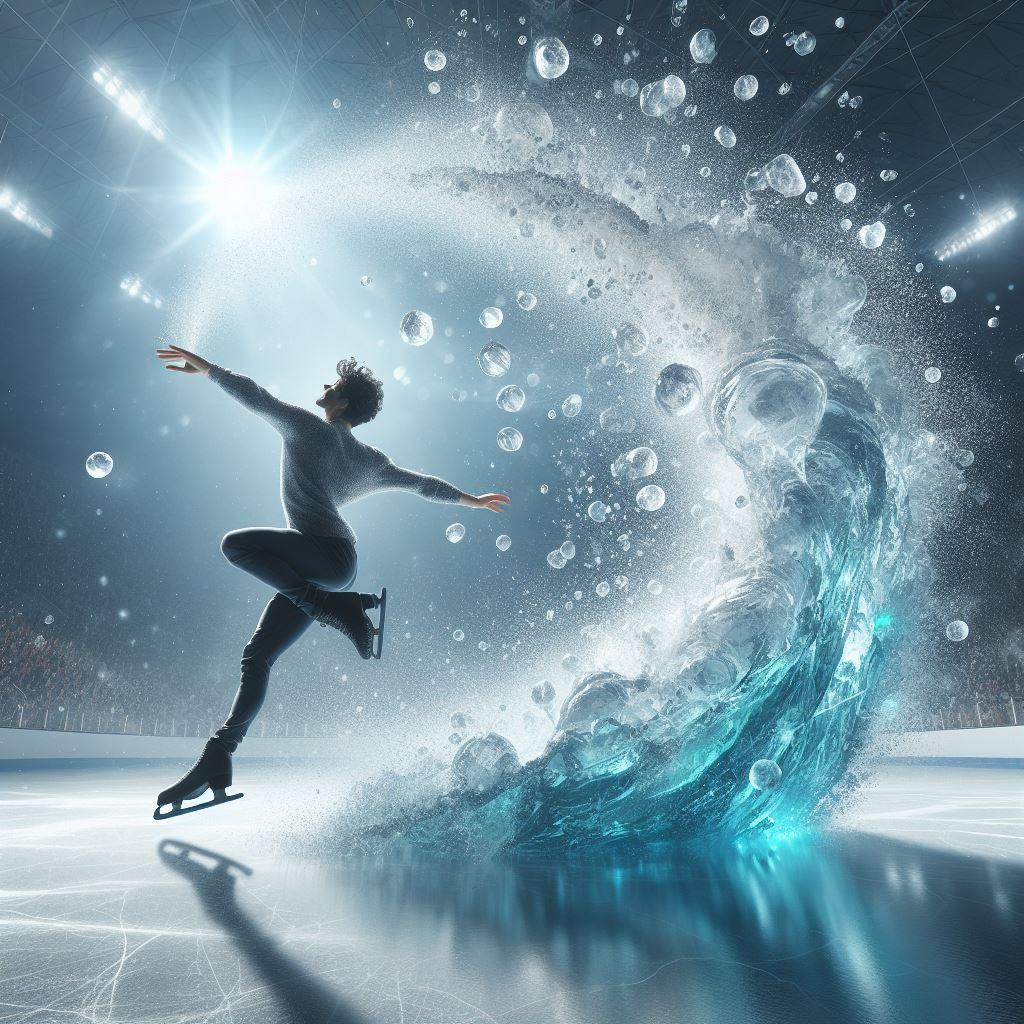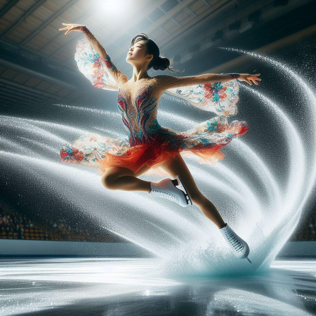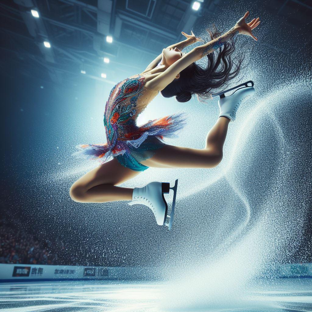 A beautiful Japanese female figure ice skater jumping over the camera in an ice rink arena, creating a big scattering solid ice wave. She is wearing vibrant and intricate figure ice skating attire. The image is taken from a dynamic angle, with soft lighting, heavy shadow, and soft focus, capturing the elegance and athleticism of the skater. The scene emphasizes the motion and artistry of figure skating, with the scattering ice wave adding a dramatic effect to the skater's jump.