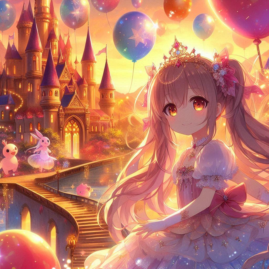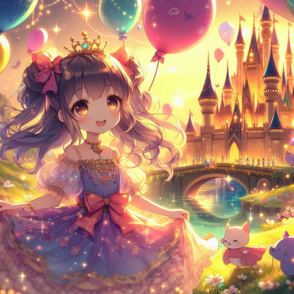 意図:幼いプリンセスのような女の子が、ファンタジーの世界で壮大なお城を背景に夢を見ているシーンが描かれています。カラフルな風景に浮かぶ風船や魔法の生き物たちが、彼女を取り囲んでいます。彼女のきらめくドレスや無邪気な笑顔が、夢と憧れに満ちた物語の世界を象徴し、幻想的な旅が描かれています。
