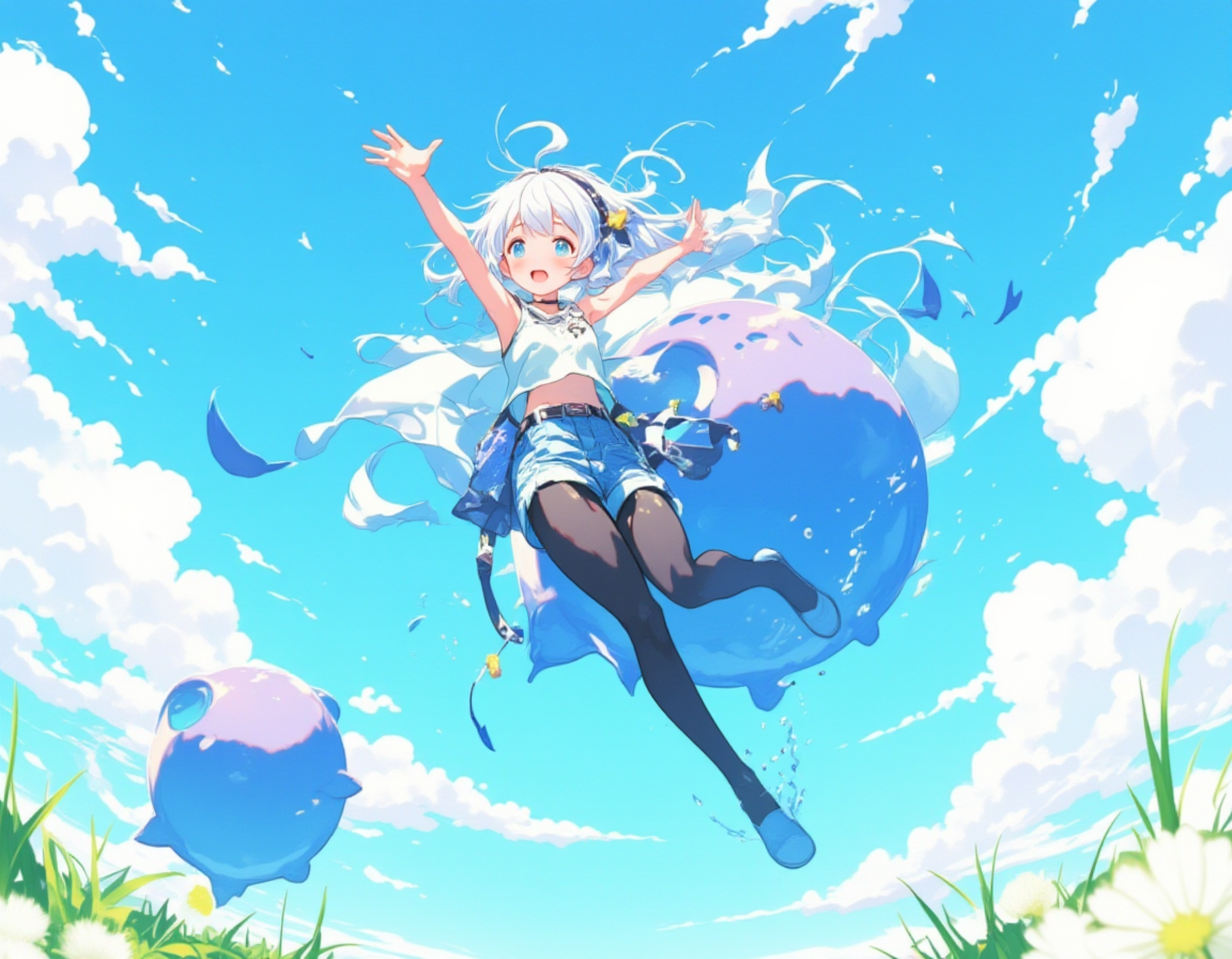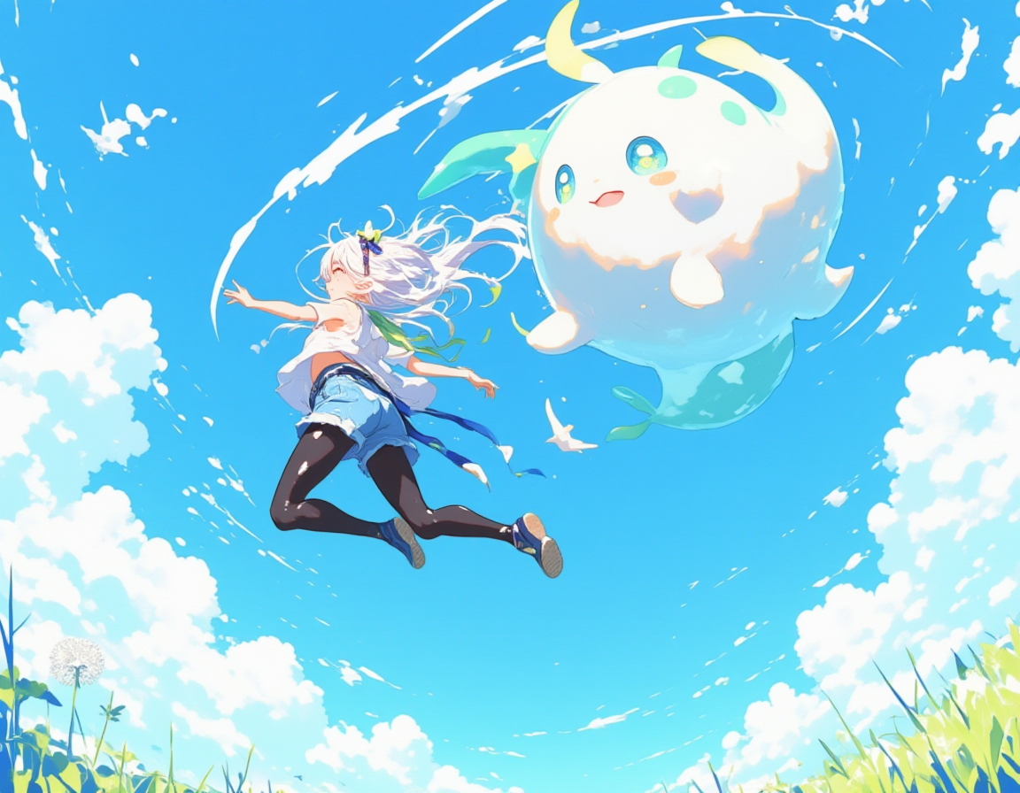 Situation: A dynamic,action-packed scene where a young girl is mid-air,seemingly leaping or falling with energy and excitement,accompanied by a playful interaction with a large floating creature.,