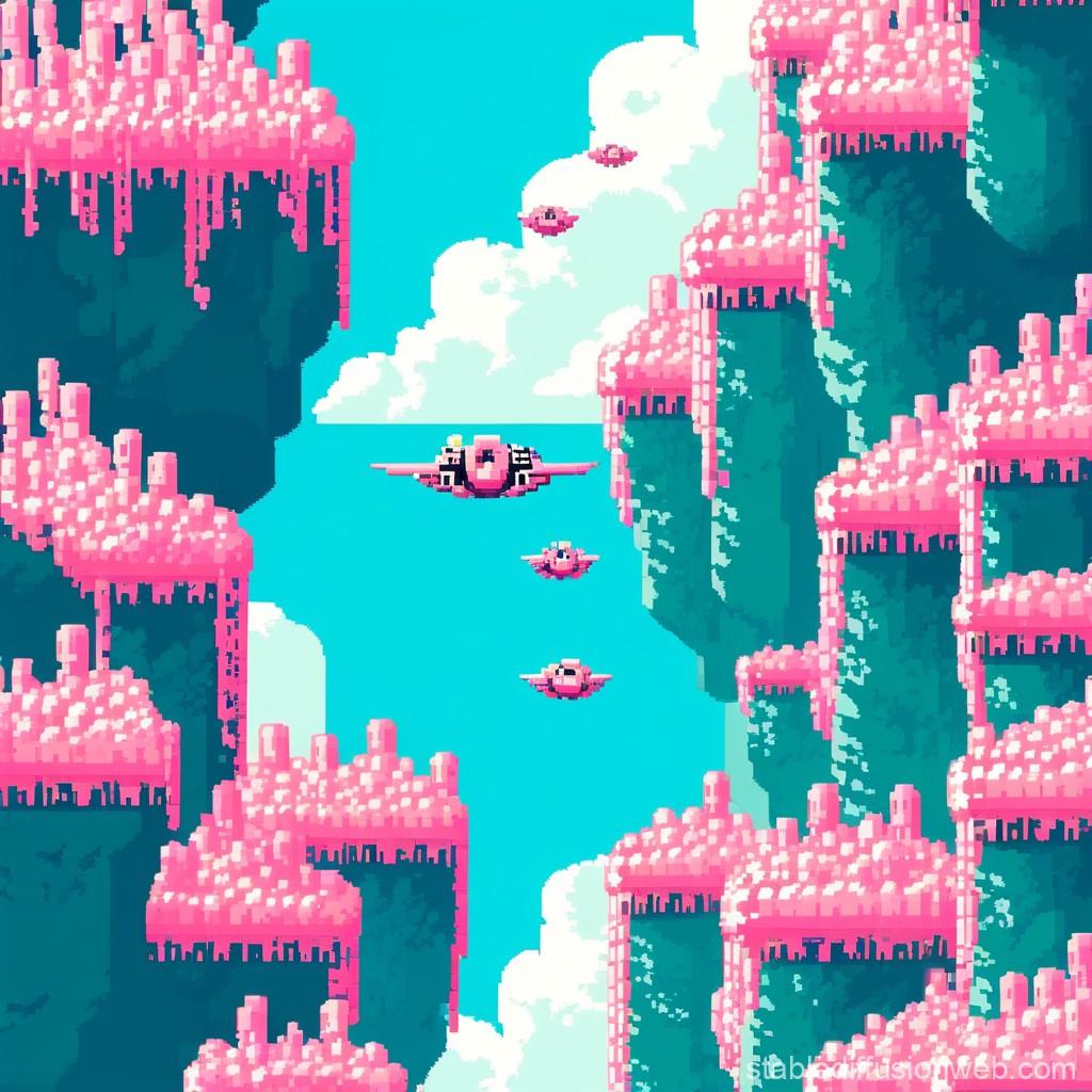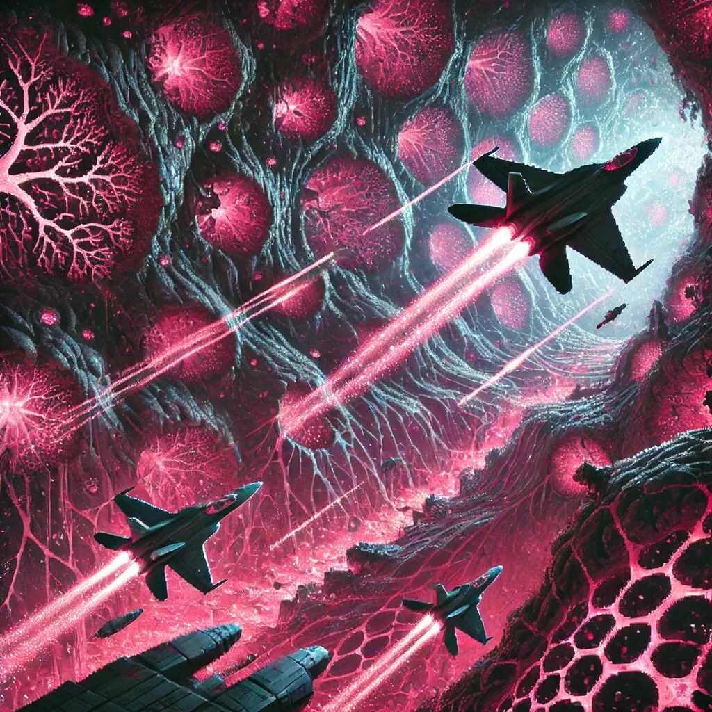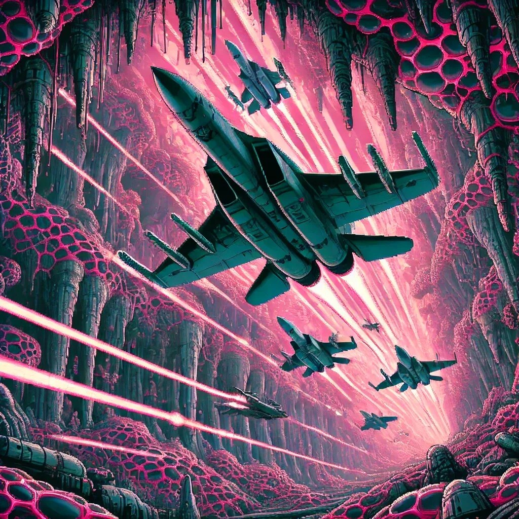 洞窟内の有機的なピンクの細胞と、スピード感あふれる戦闘機が対照的で、迫力のあるシーンに仕上がっていますね!🚀🍑