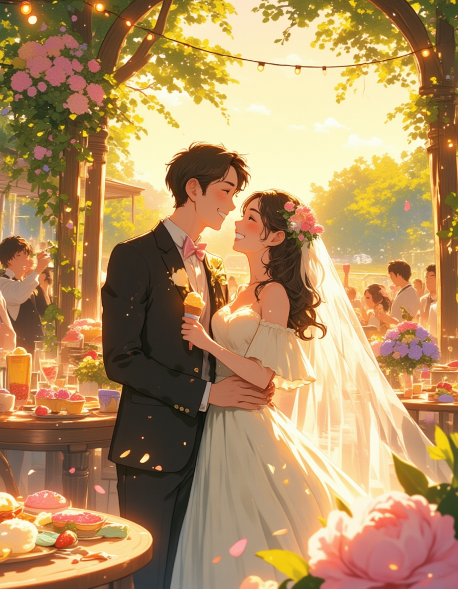 A radiant bride and a charming groom,exuding love and joy,with subtle dessert-inspired accents tying them to the summer sweets theme. Background figures (optional) are faintly visible,enjoying desserts or dancing,to enhance the festive mood without overshadowing the couple.,
