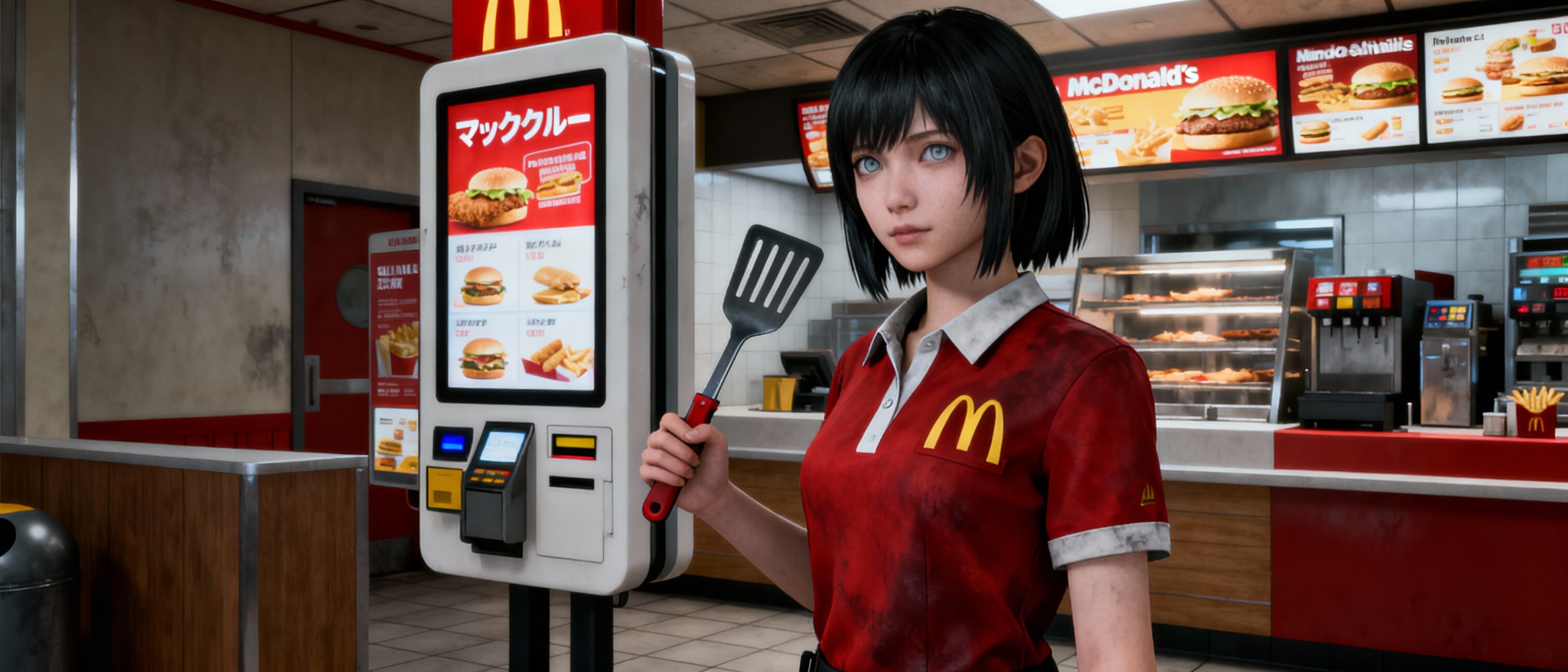 6. **背景の描写**: 10点 (マクドナルド店内、セルフレジ、メニューがホラーテイストに完璧に落とし込まれている)