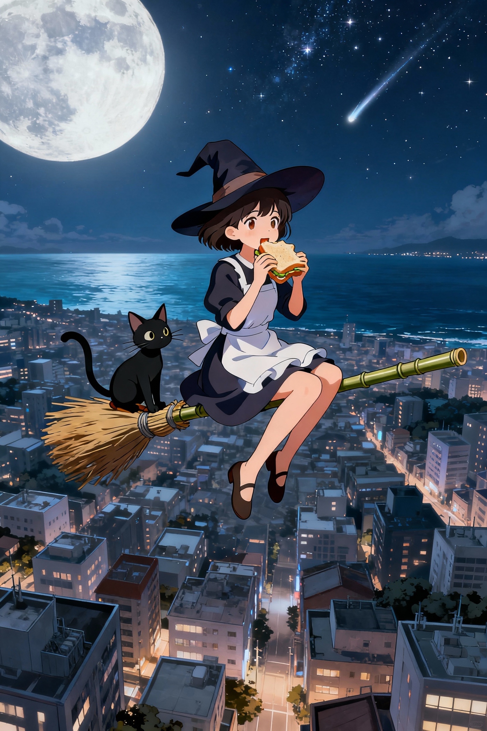 Seedream. 竹箒に乗ってサンドイッチを食べる魔女