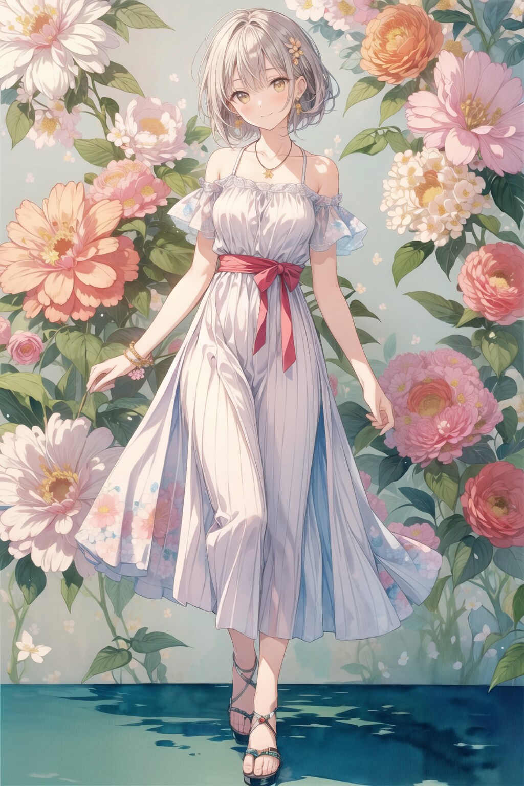 ⑦(bare shoulders dress:1.3), (long skirt:1.3), short sleeves, (sandal:1.2), necklace,