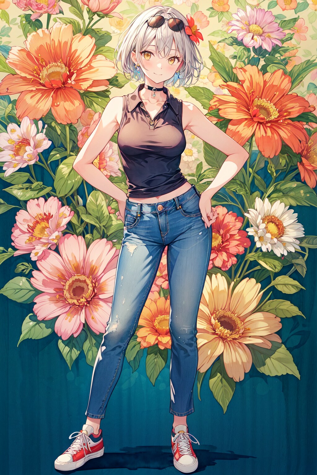 ②collared shirt, (denim pants:1.4), (sleeveless:1.3), (sneakers:1.2), choker, sunglasses,